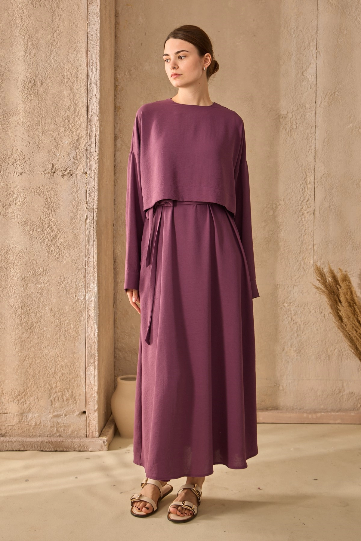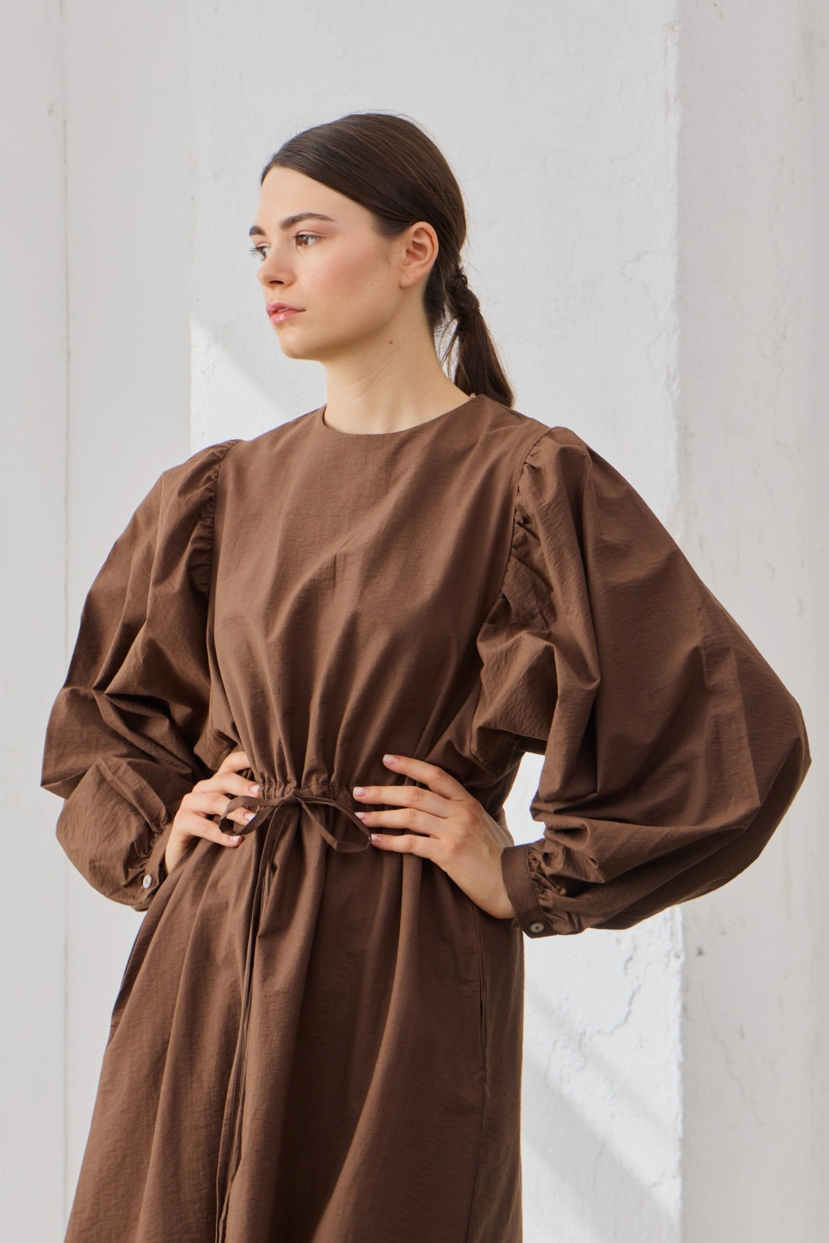 Qanu Pamuklu Büzgülü Elbise Kahverengi