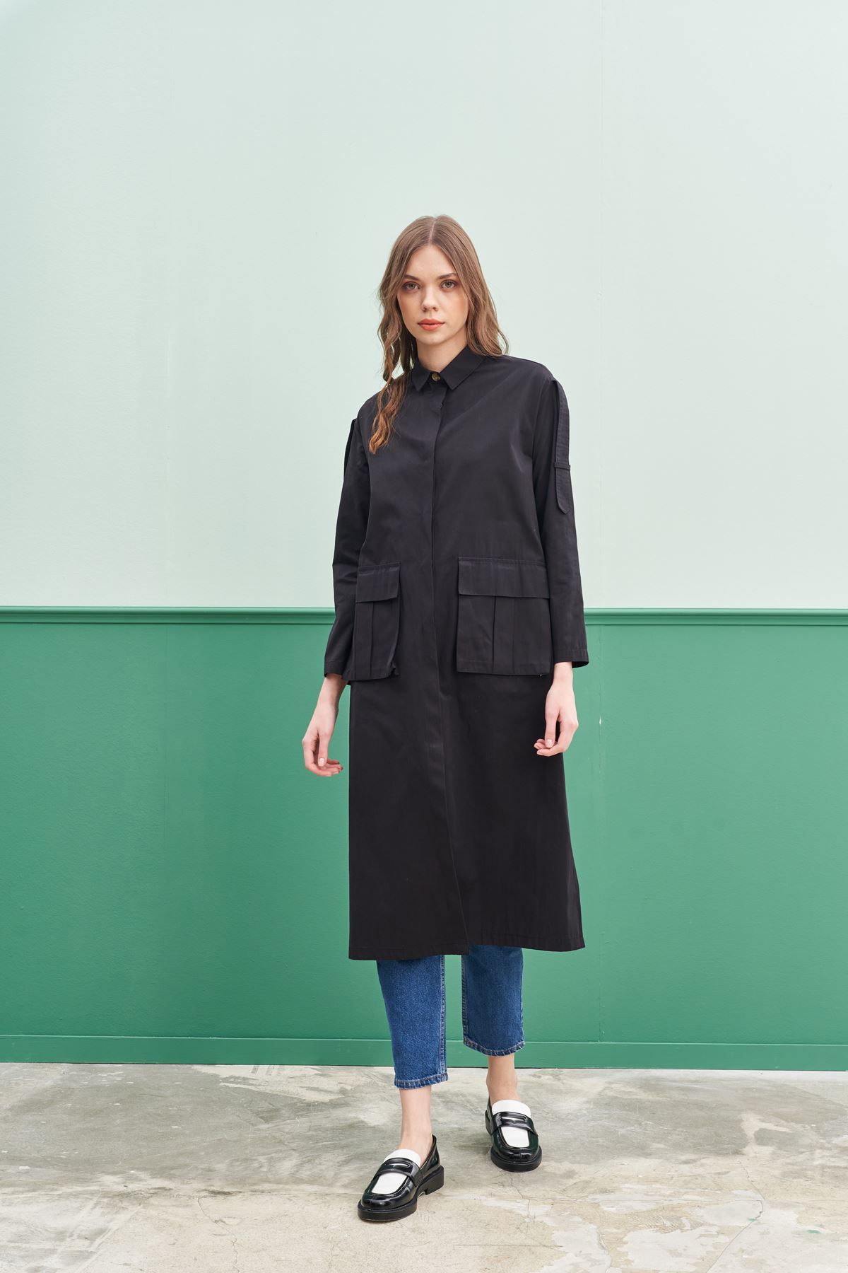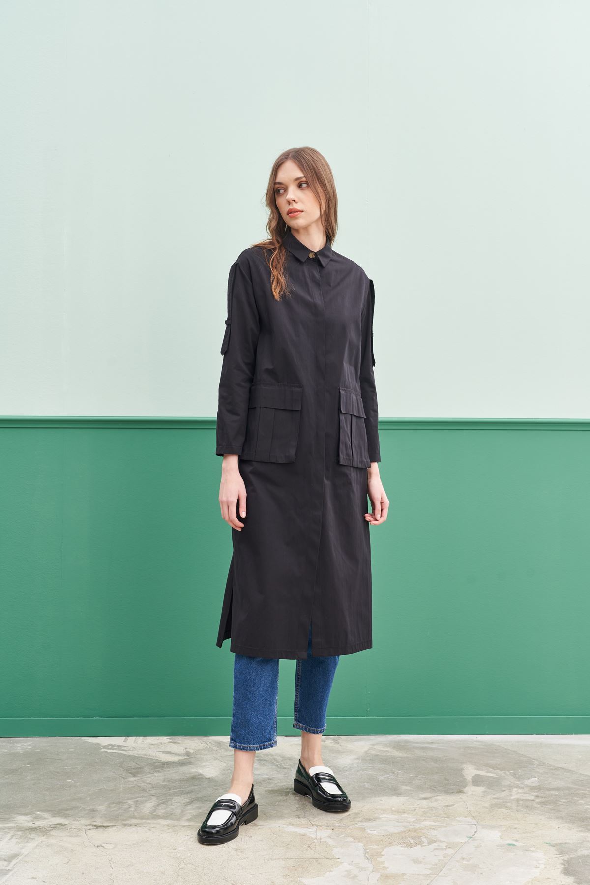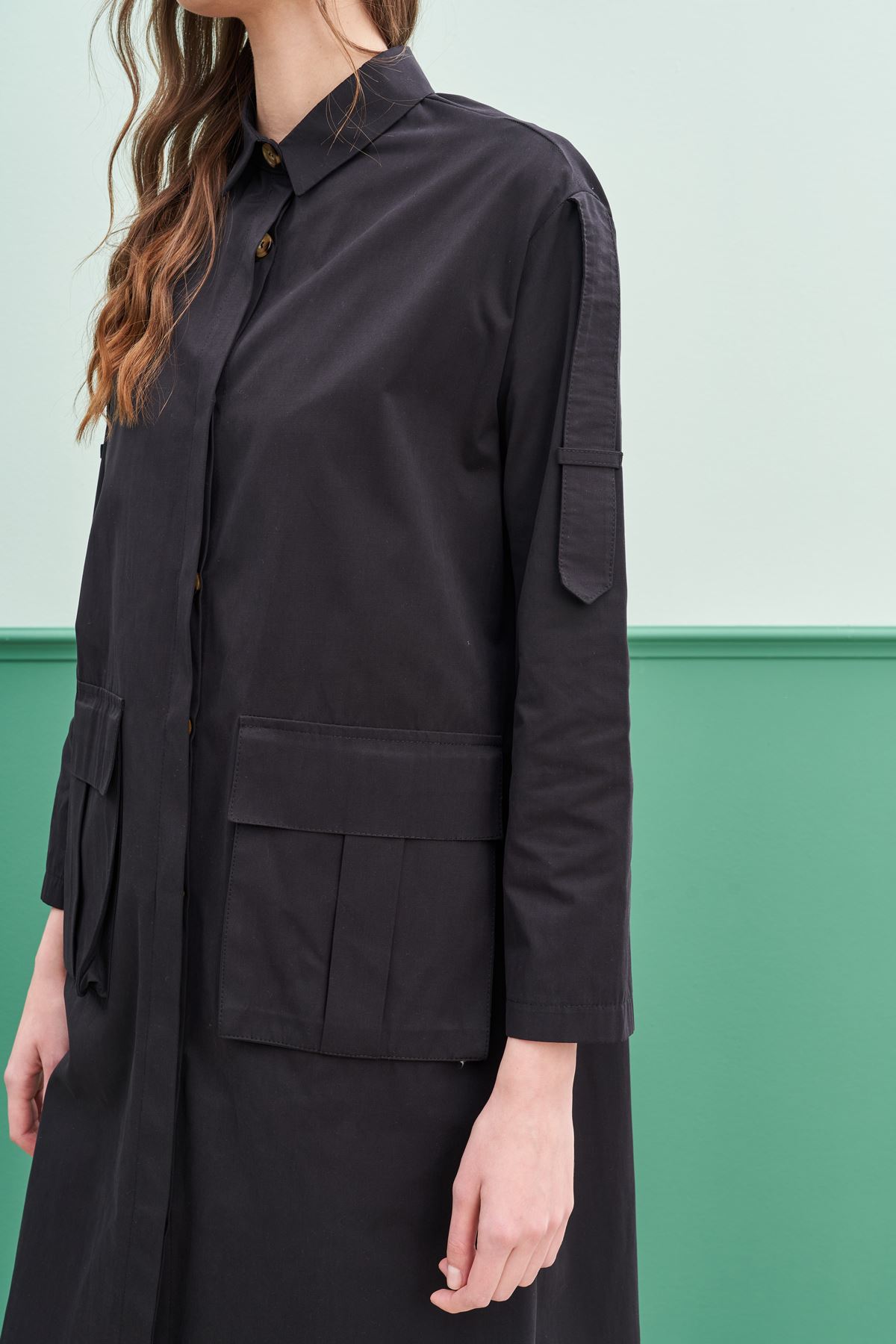 Qanu Körük Cepli Trençkot Siyah