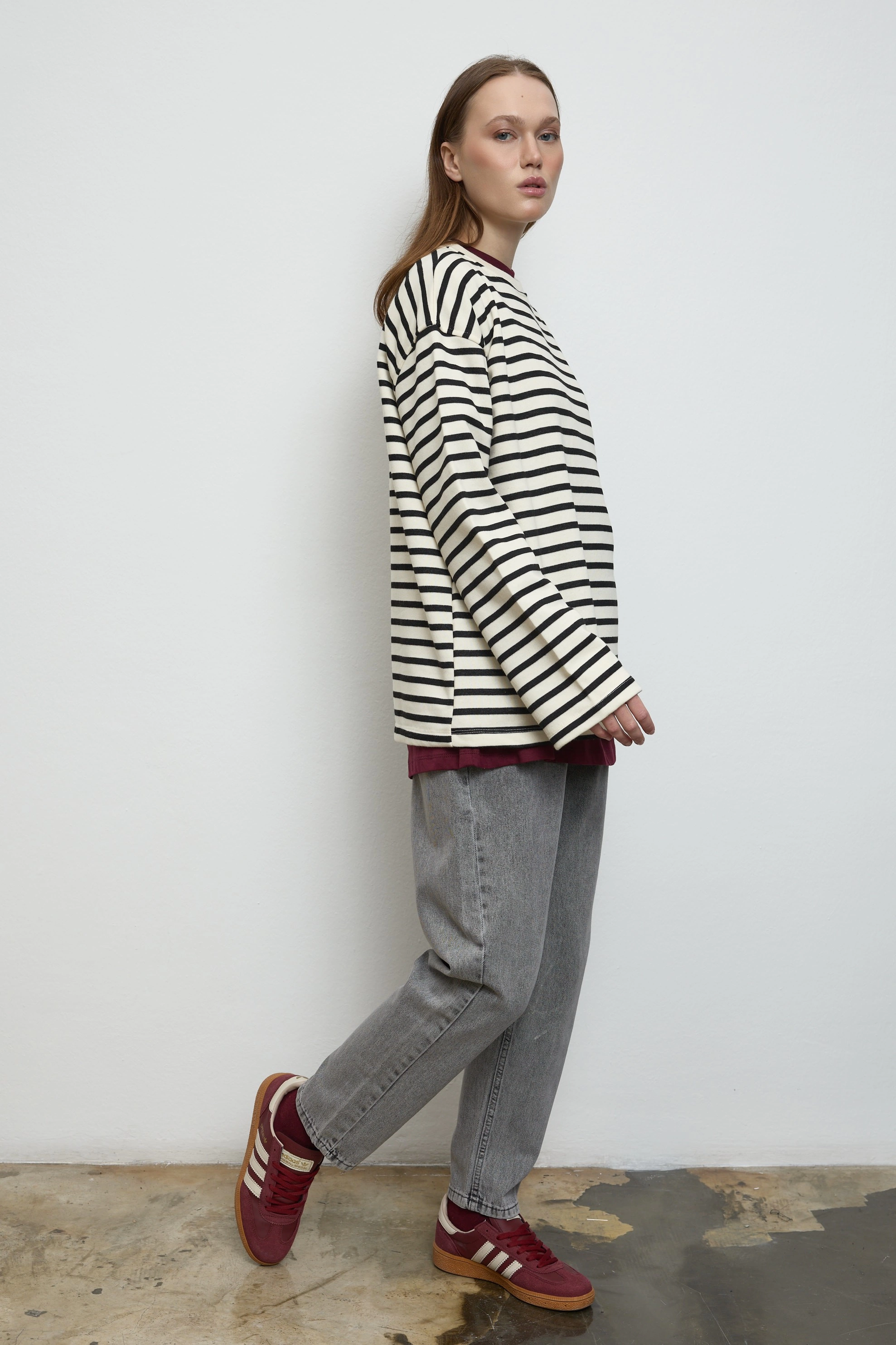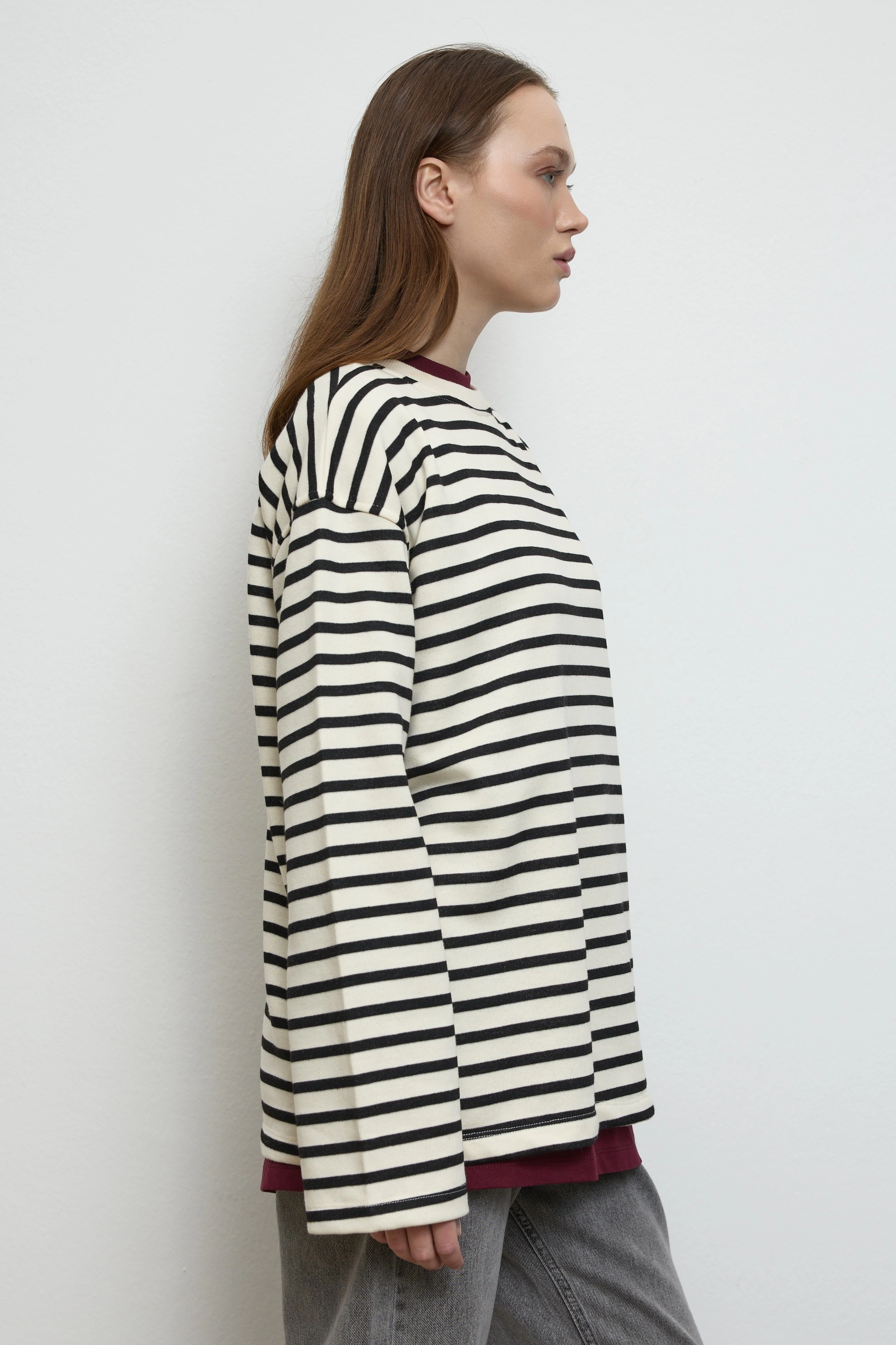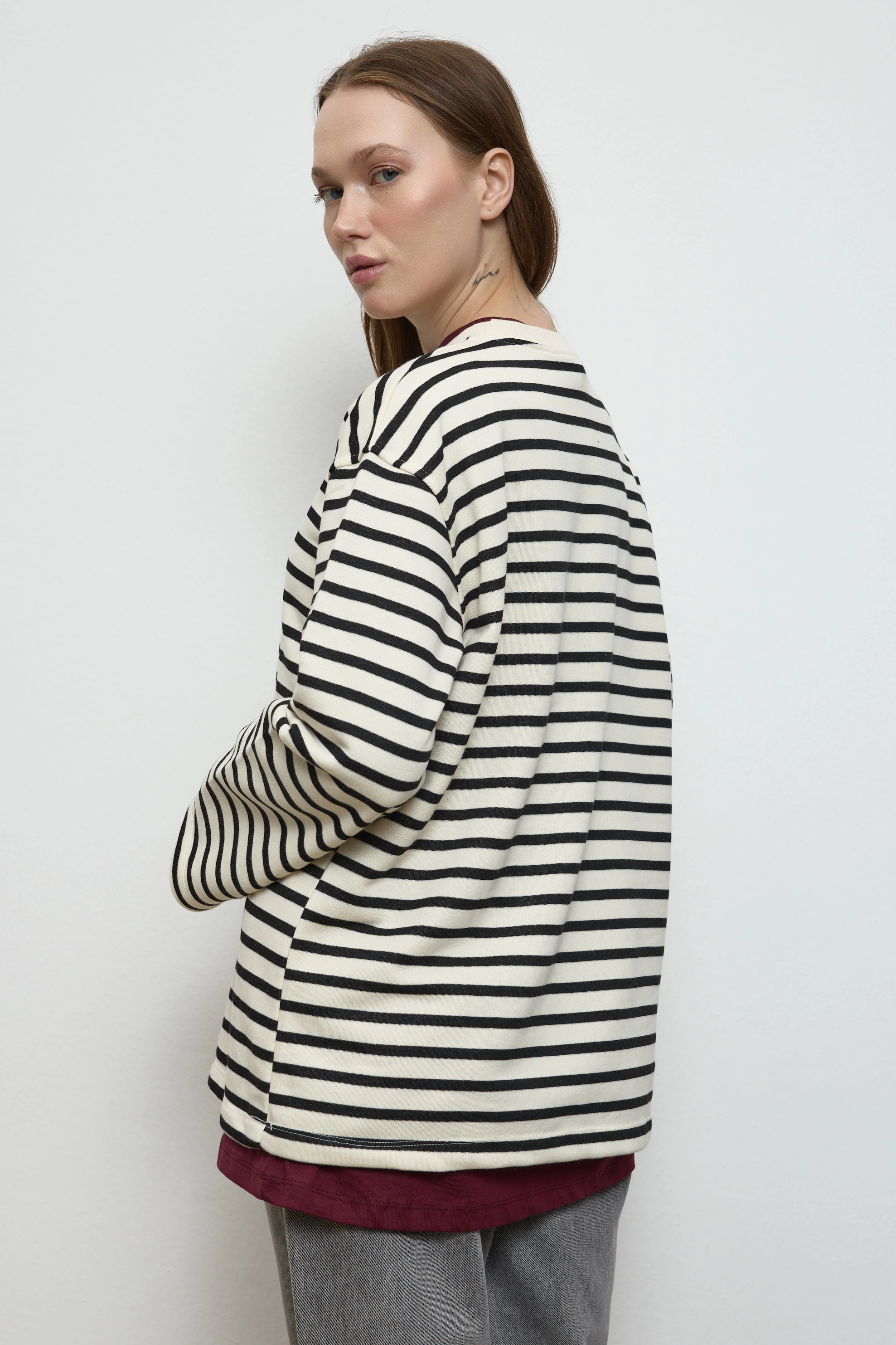 Qanu Basıc Çizgili Uzun Sweatshirt Siyah