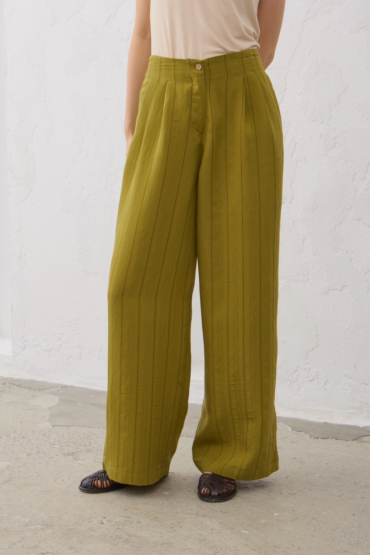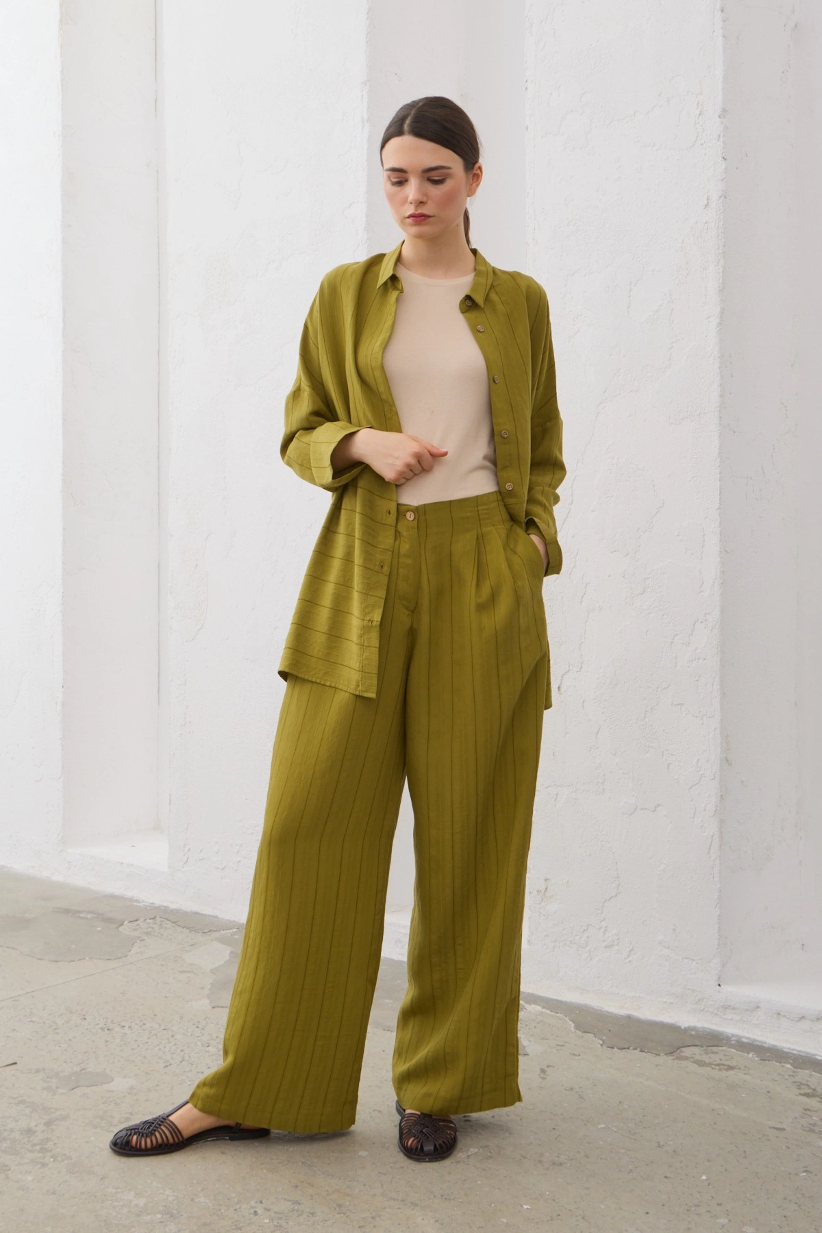 Qanu Önü Pileli Krep Pantolon Yağ Yeşili