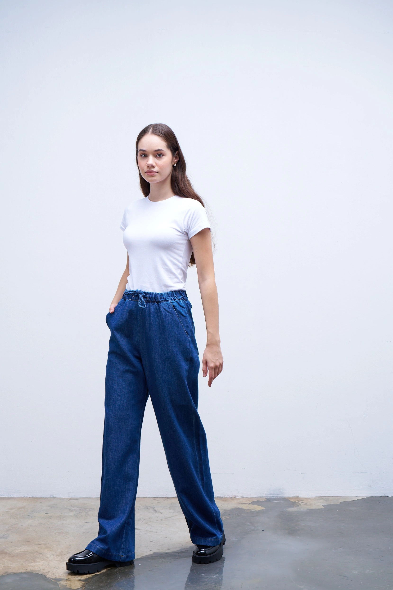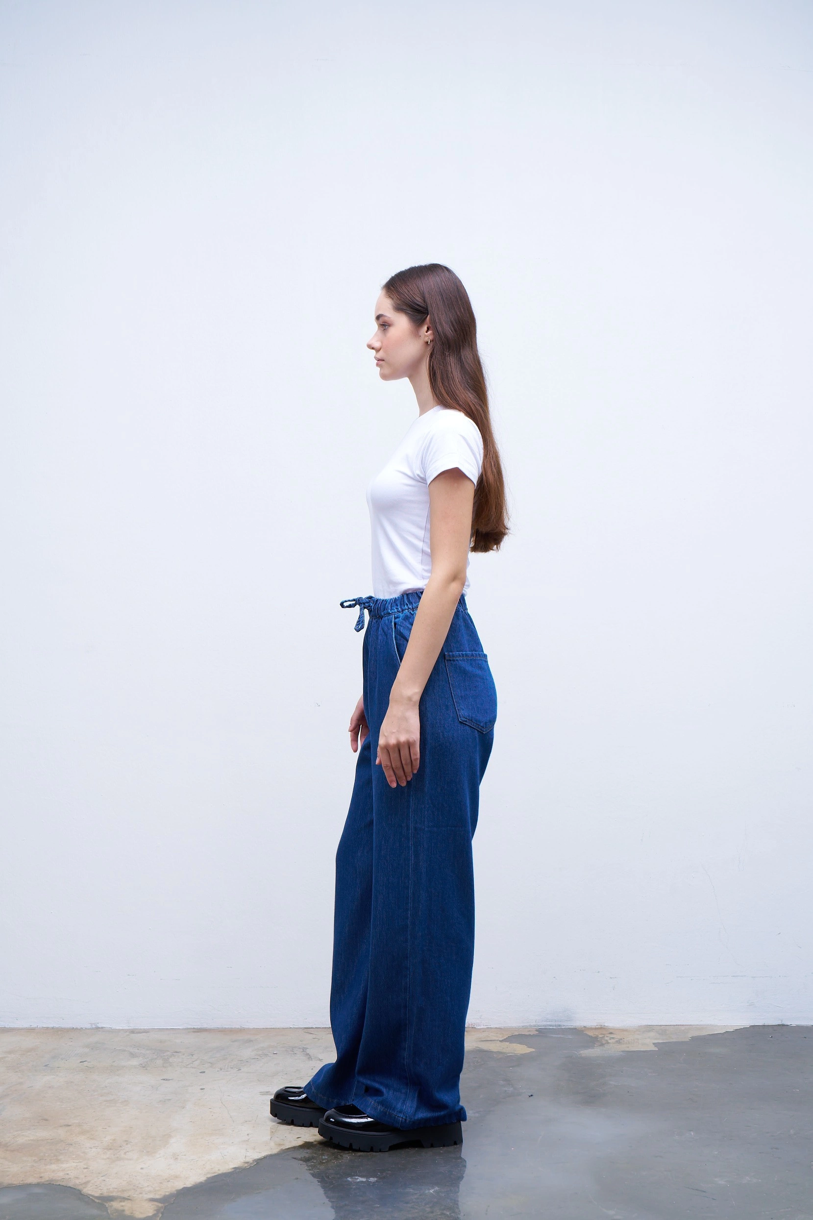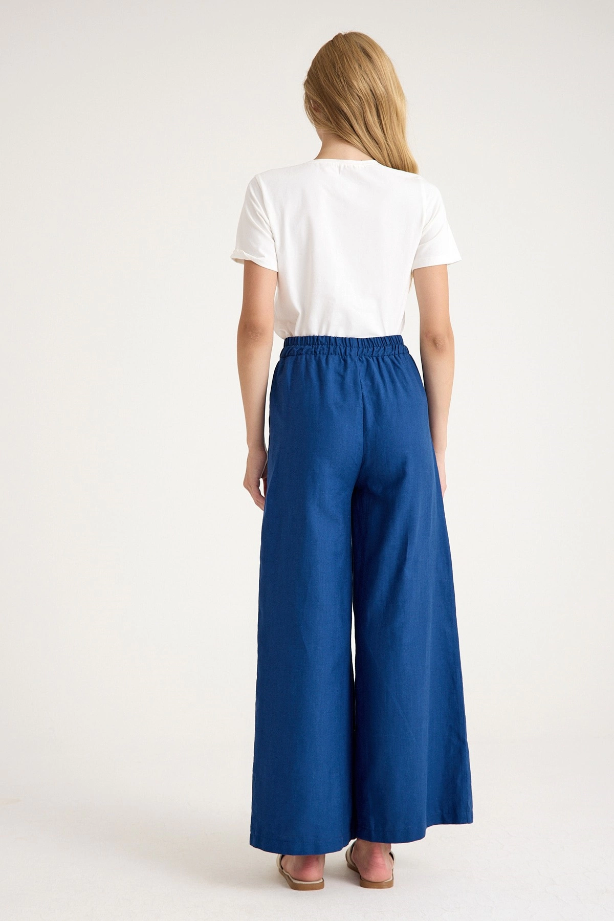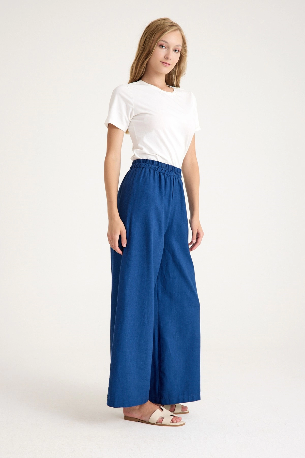Qanu Pamuklu Bol Paça Pantolon Koyu Mavi