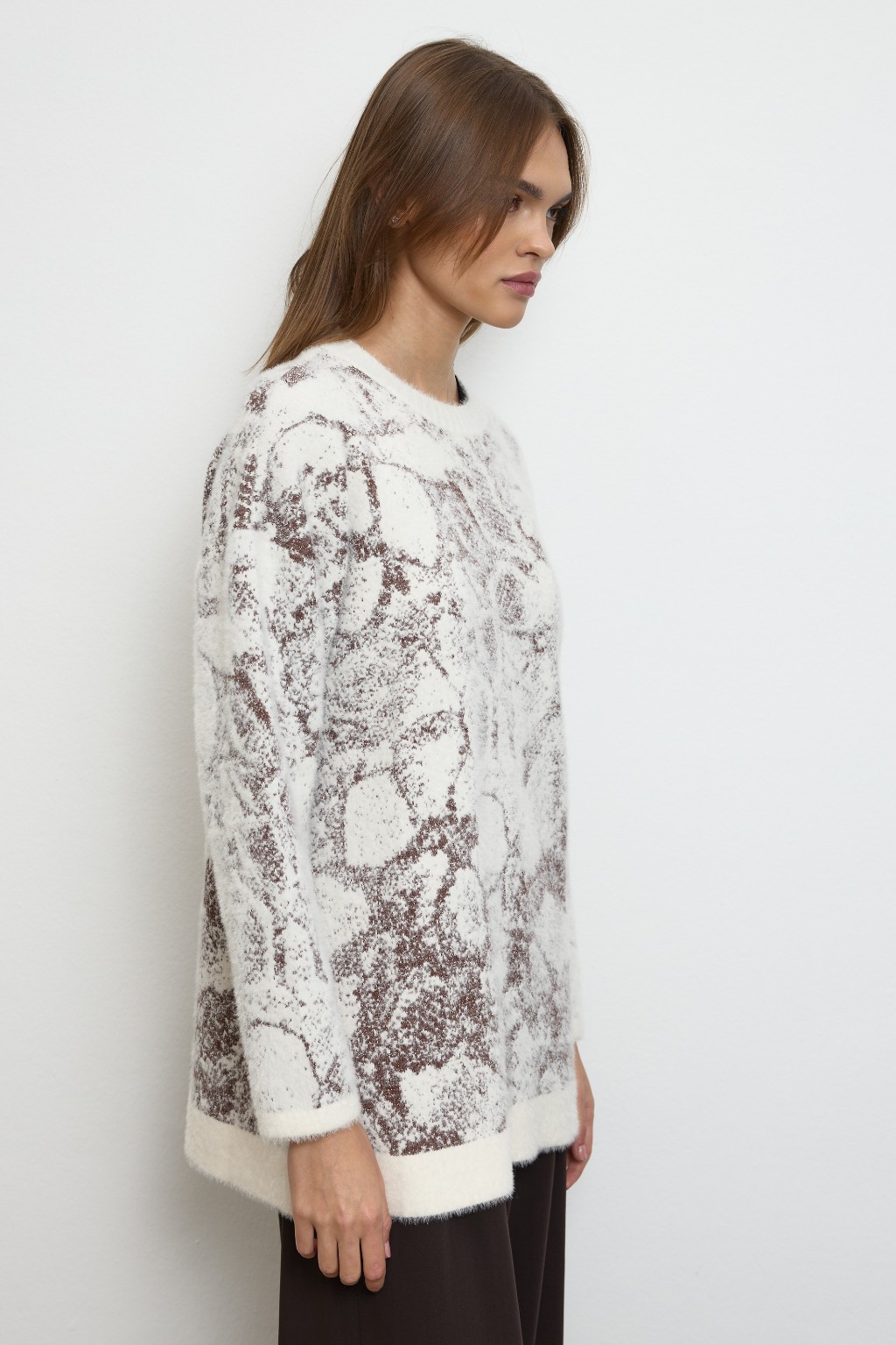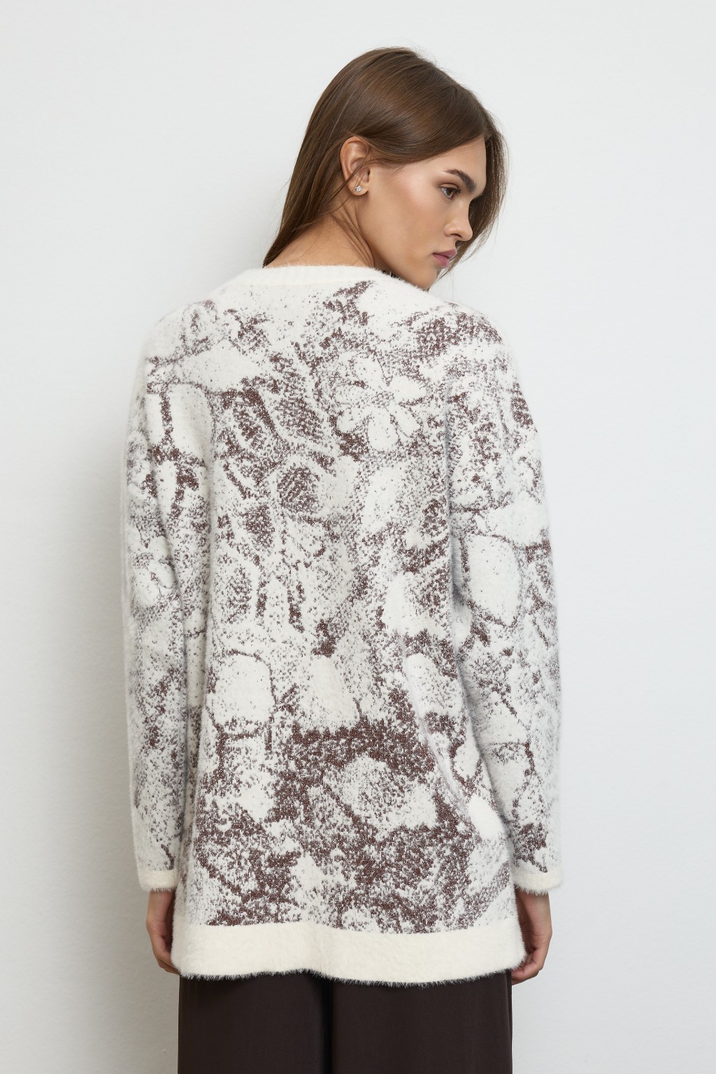 -Yumuşacık angora kumaştan üretilmiş, şıklığı ve konforu bir araya getiren desenli triko kazak. Günlük stilinize sıcak bir dokunuş katın.