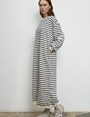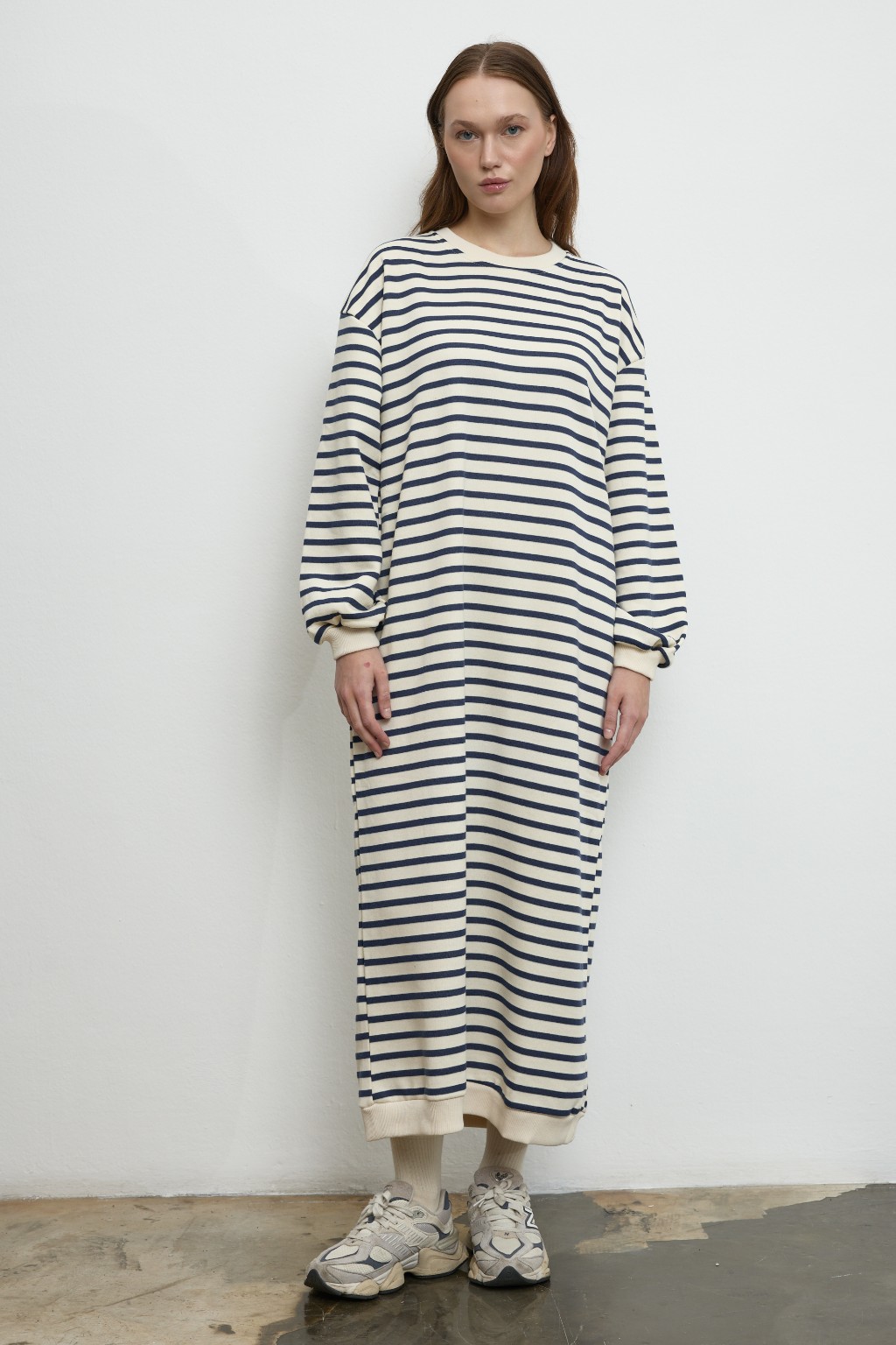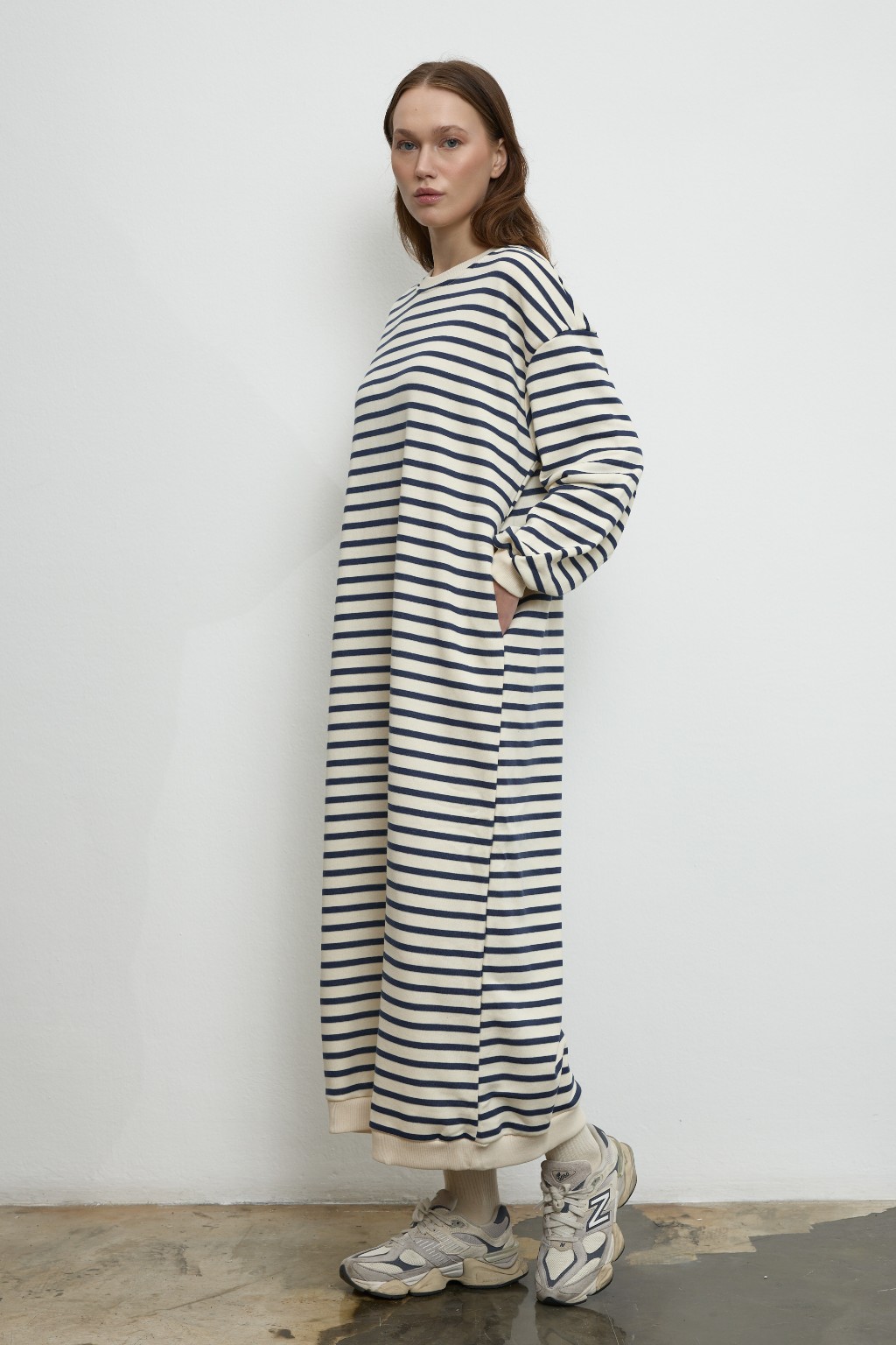 -Günün her anında hem konforlu hem de şık hissetmek isteyenler için tasarlanan bu çizgili uzun sweat elbise, sportif şıklığın en güzel yansıması. Yumuşak dokulu kumaşıyla cildinize nefes aldırırken, bisiklet yaka tasarımı ve modern çizgili deseniyle stilinize zarif bir dinamizm katıyor.