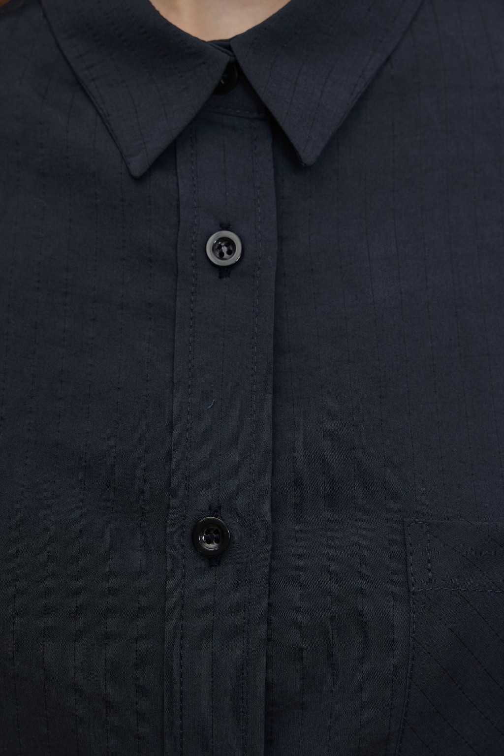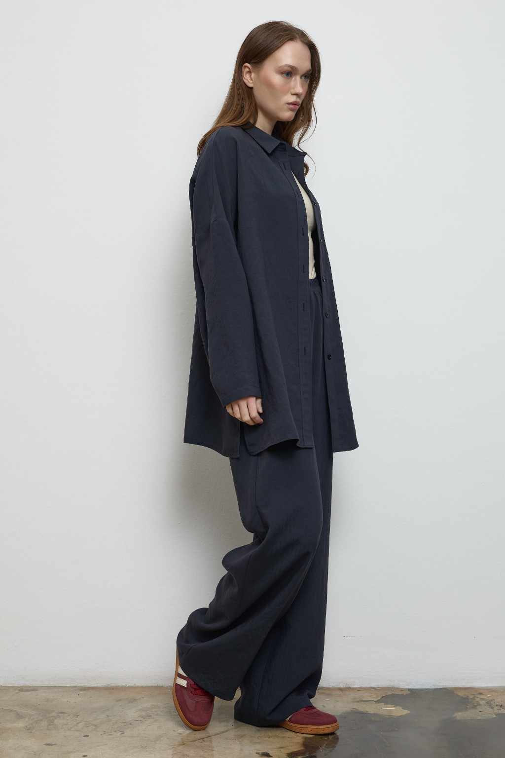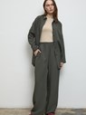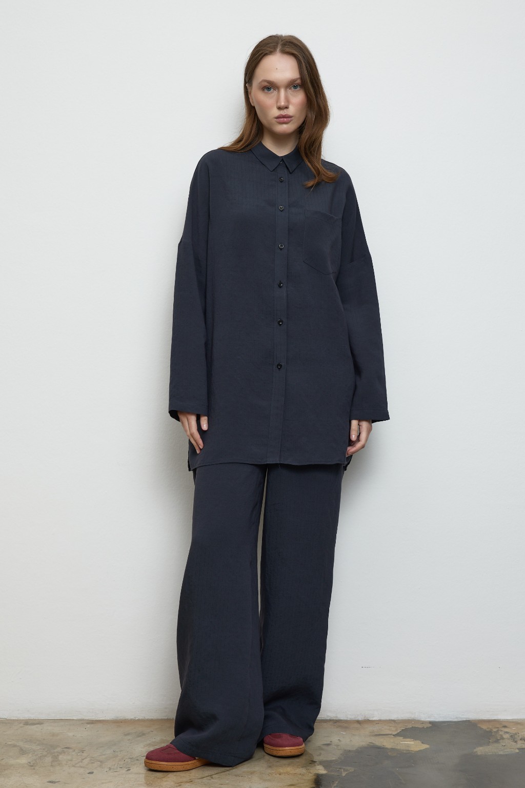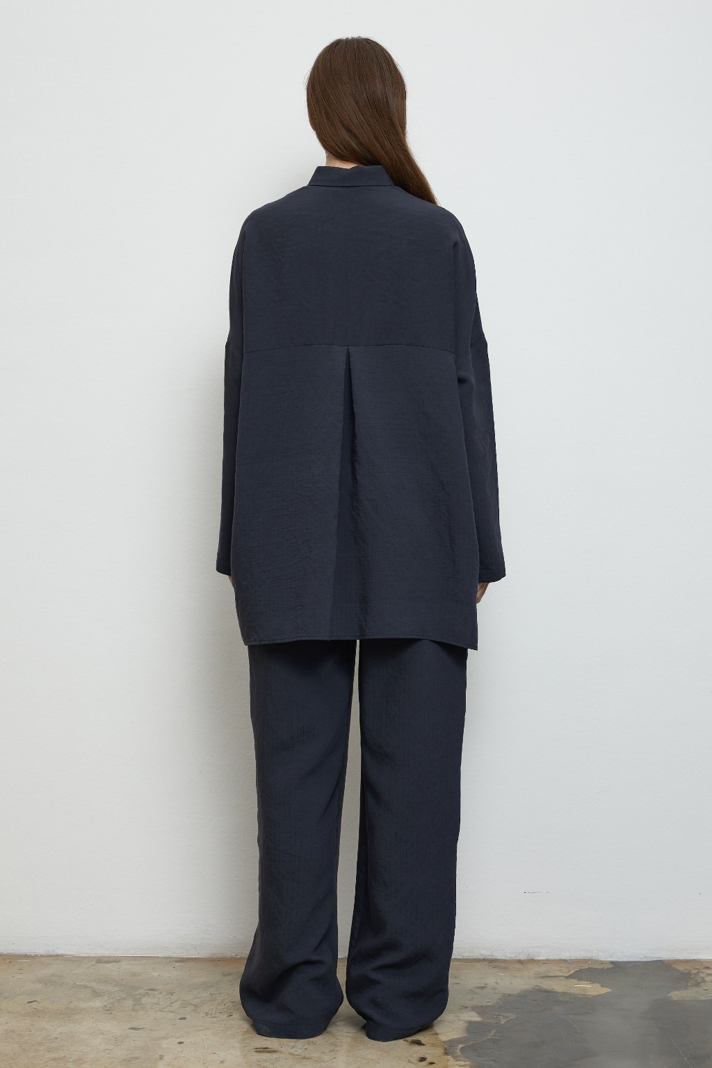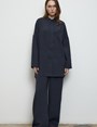 -Takımın yakalı ve düğmeli gömleği, göğüs üzerindeki cebi ve iki yandaki minik yırtmaçlarıyla dikkat çekerken; arka kısmındaki pilikaşe detayı hareket özgürlüğü sağlar.