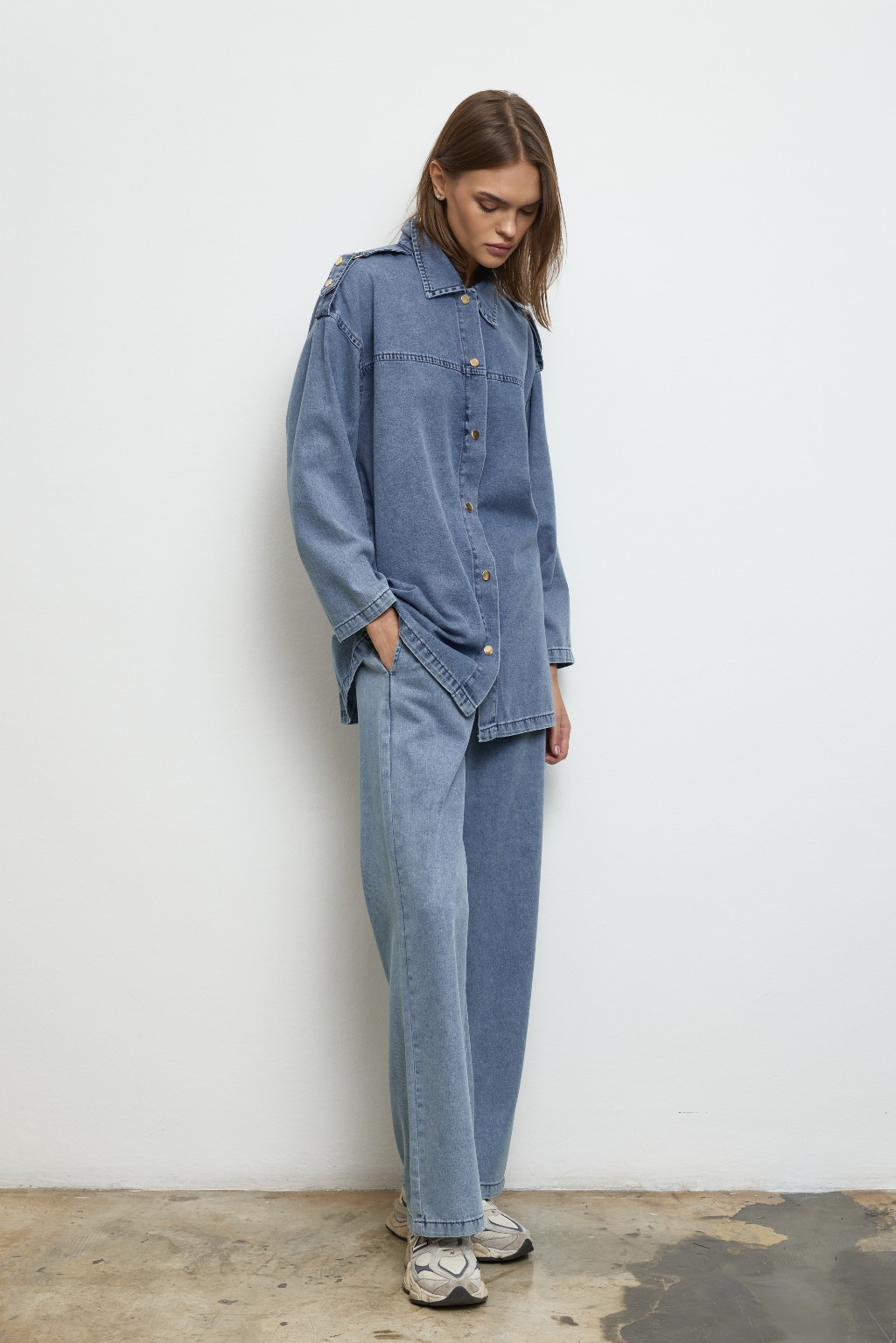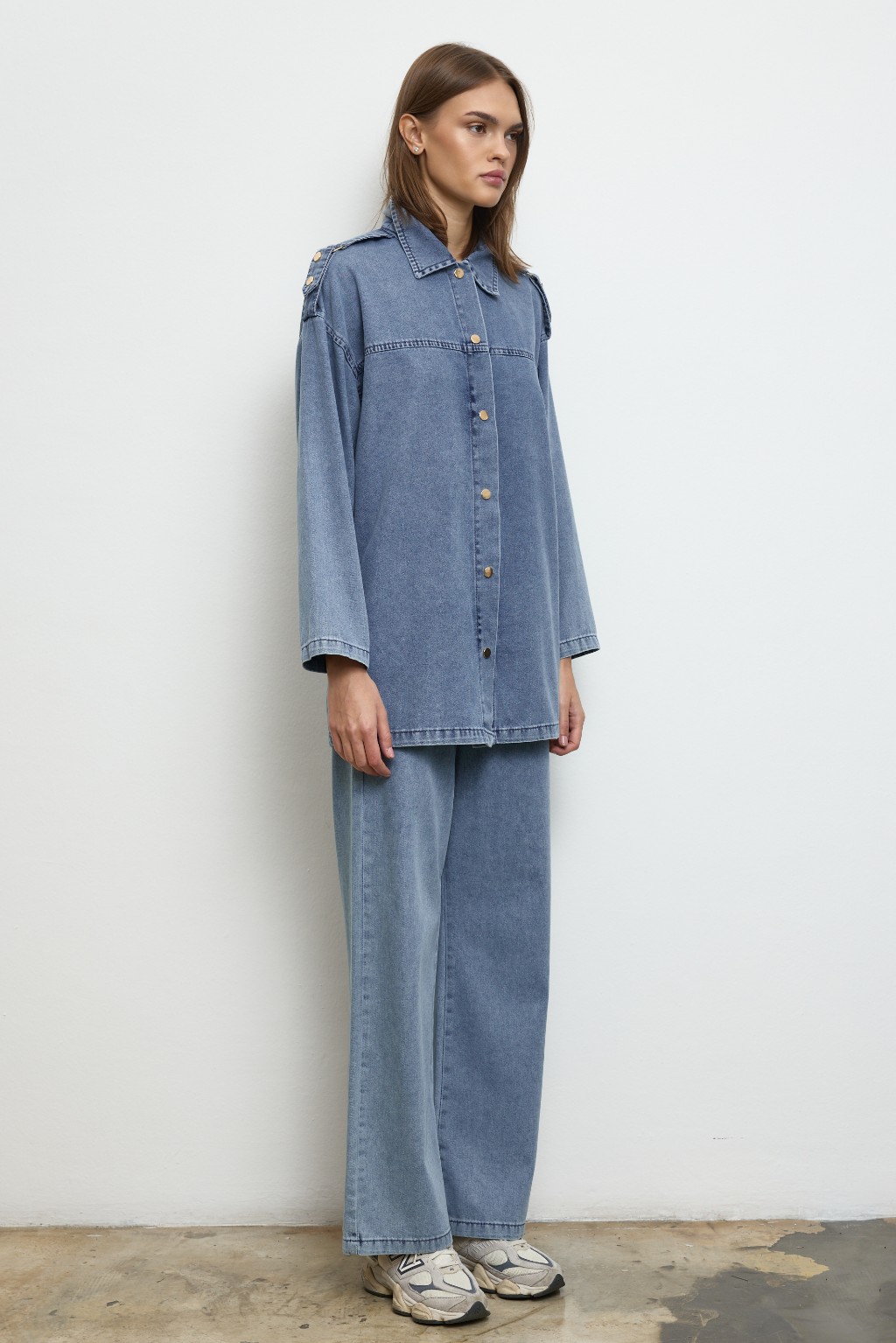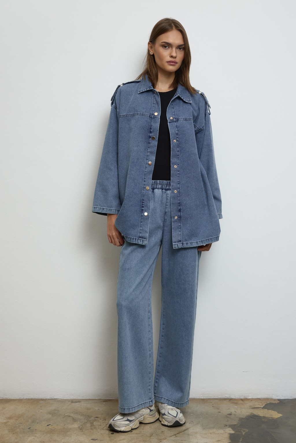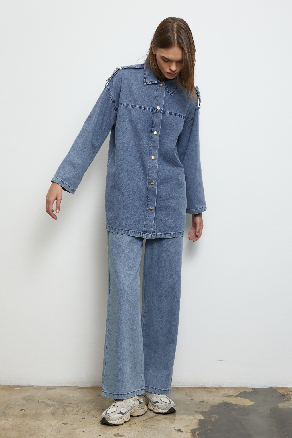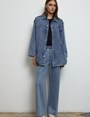 -Modern kesimi ve özenle düşünülmüş detaylarıyla denim takım, günlük stilinize güçlü bir dokunuş katıyor. Önü çıtçıt kapamalı ceket modeli, göğüs üstü dikiş detayları ve yakalı tasarımıyla sade ama dikkat çekici bir duruş sunuyor.