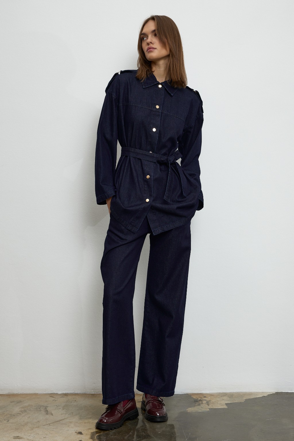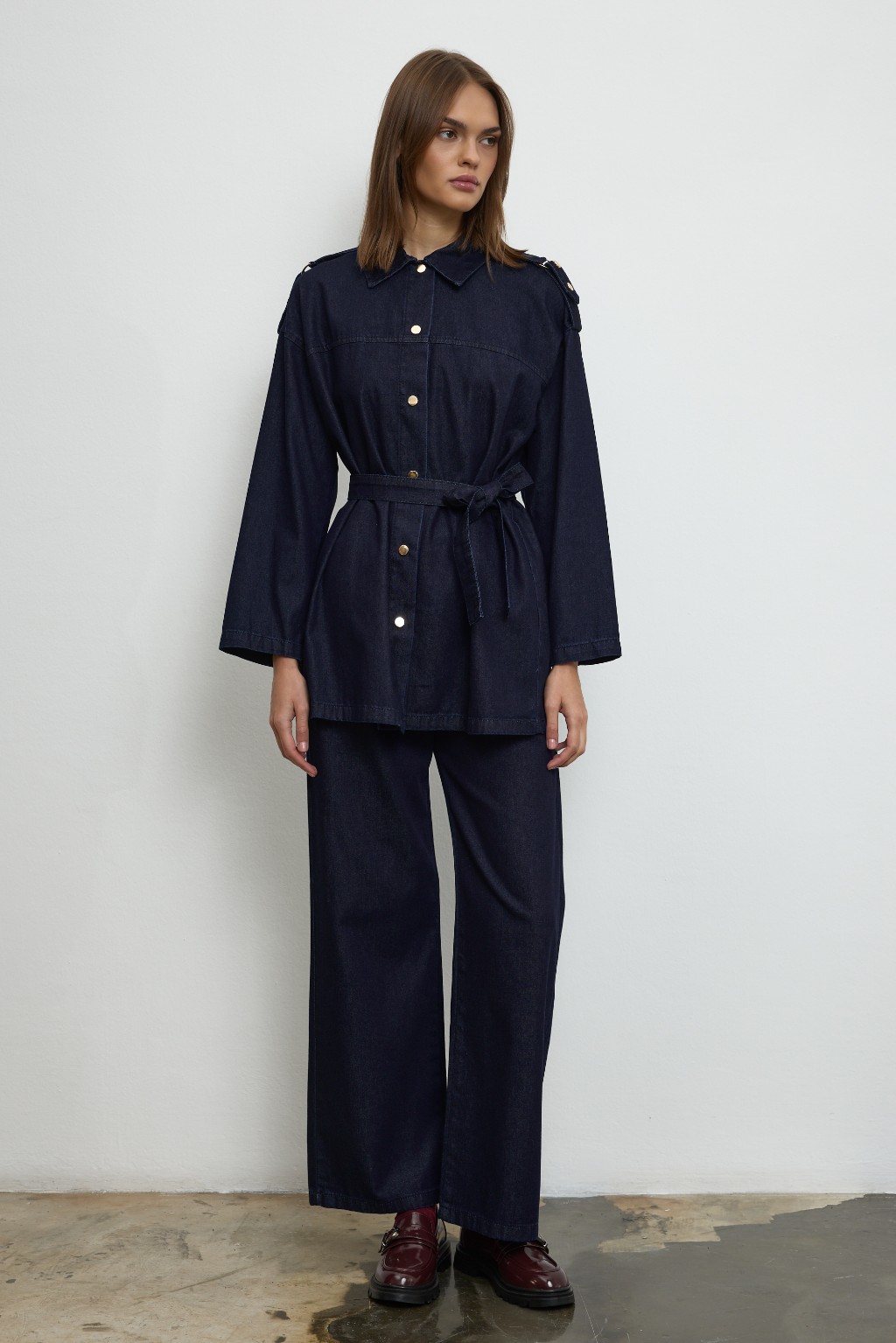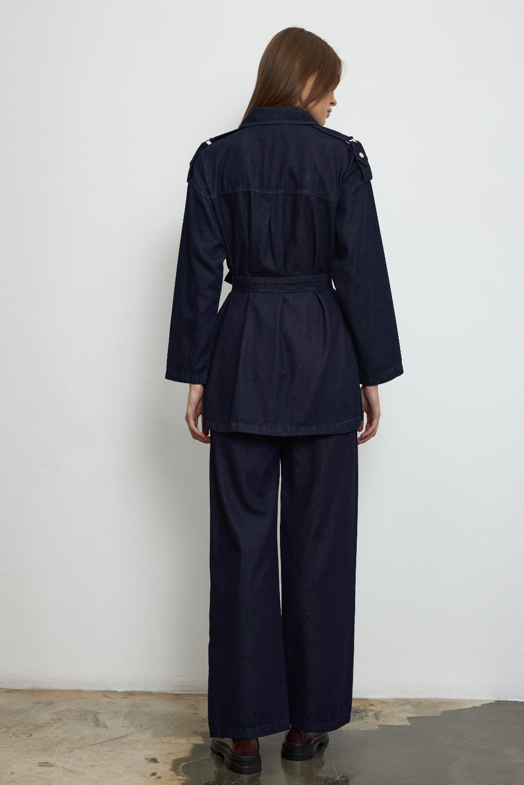 -Modern kesimi ve özenle düşünülmüş detaylarıyla denim takım, günlük stilinize güçlü bir dokunuş katıyor. Önü çıtçıt kapamalı ceket modeli, göğüs üstü dikiş detayları ve yakalı tasarımıyla sade ama dikkat çekici bir duruş sunuyor.