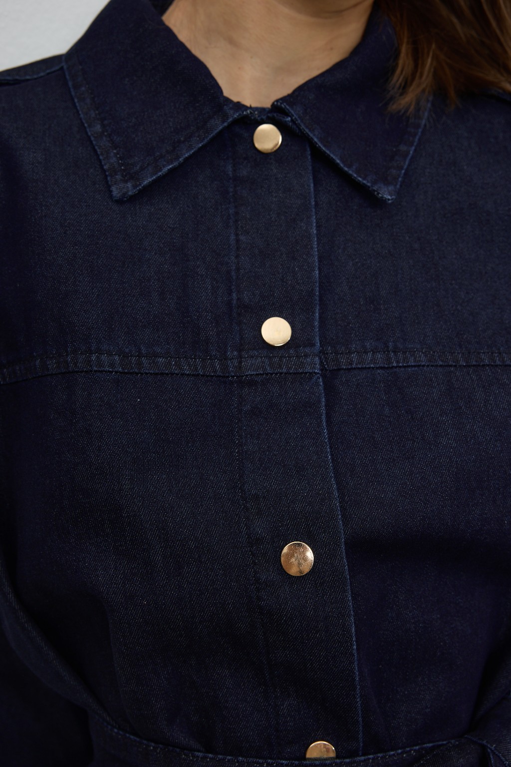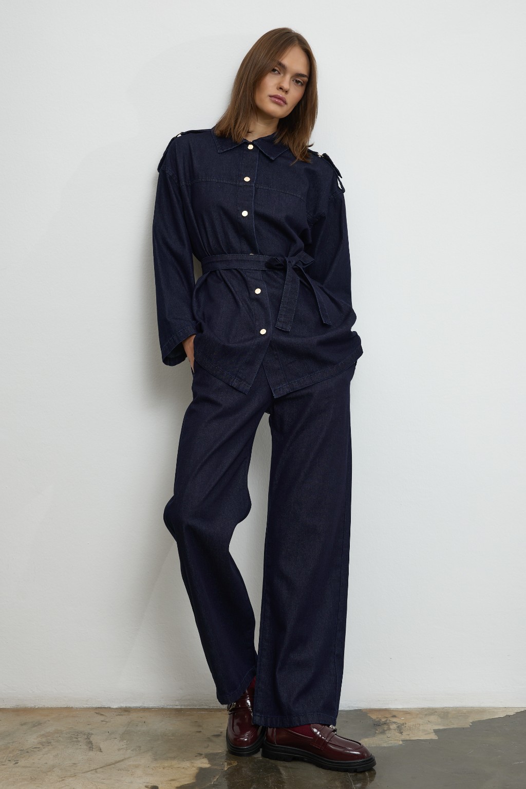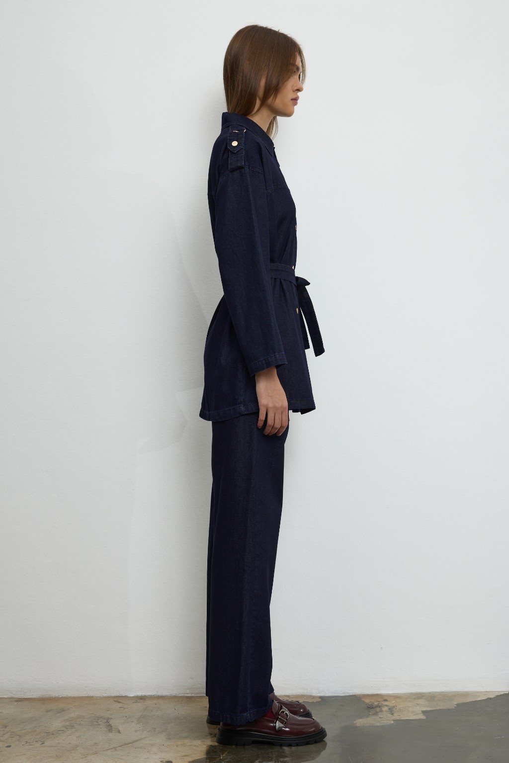 -Modern kesimi ve özenle düşünülmüş detaylarıyla denim takım, günlük stilinize güçlü bir dokunuş katıyor. Önü çıtçıt kapamalı ceket modeli, göğüs üstü dikiş detayları ve yakalı tasarımıyla sade ama dikkat çekici bir duruş sunuyor.