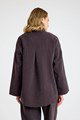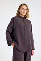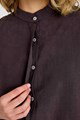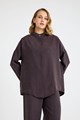 -Hakim yakalı, gizli düğmeli gömlek; kolundaki süs dikişleri ve oval etek kesimiyle modern bir duruş sergiler.