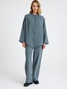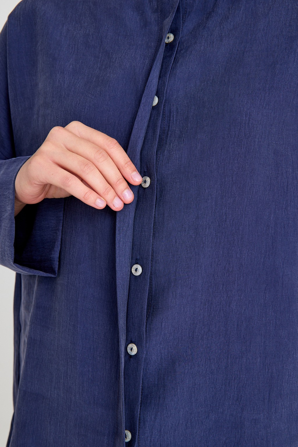 -Hakim yakalı, gizli düğmeli gömlek; kolundaki süs dikişleri ve oval etek kesimiyle modern bir duruş sergiler.