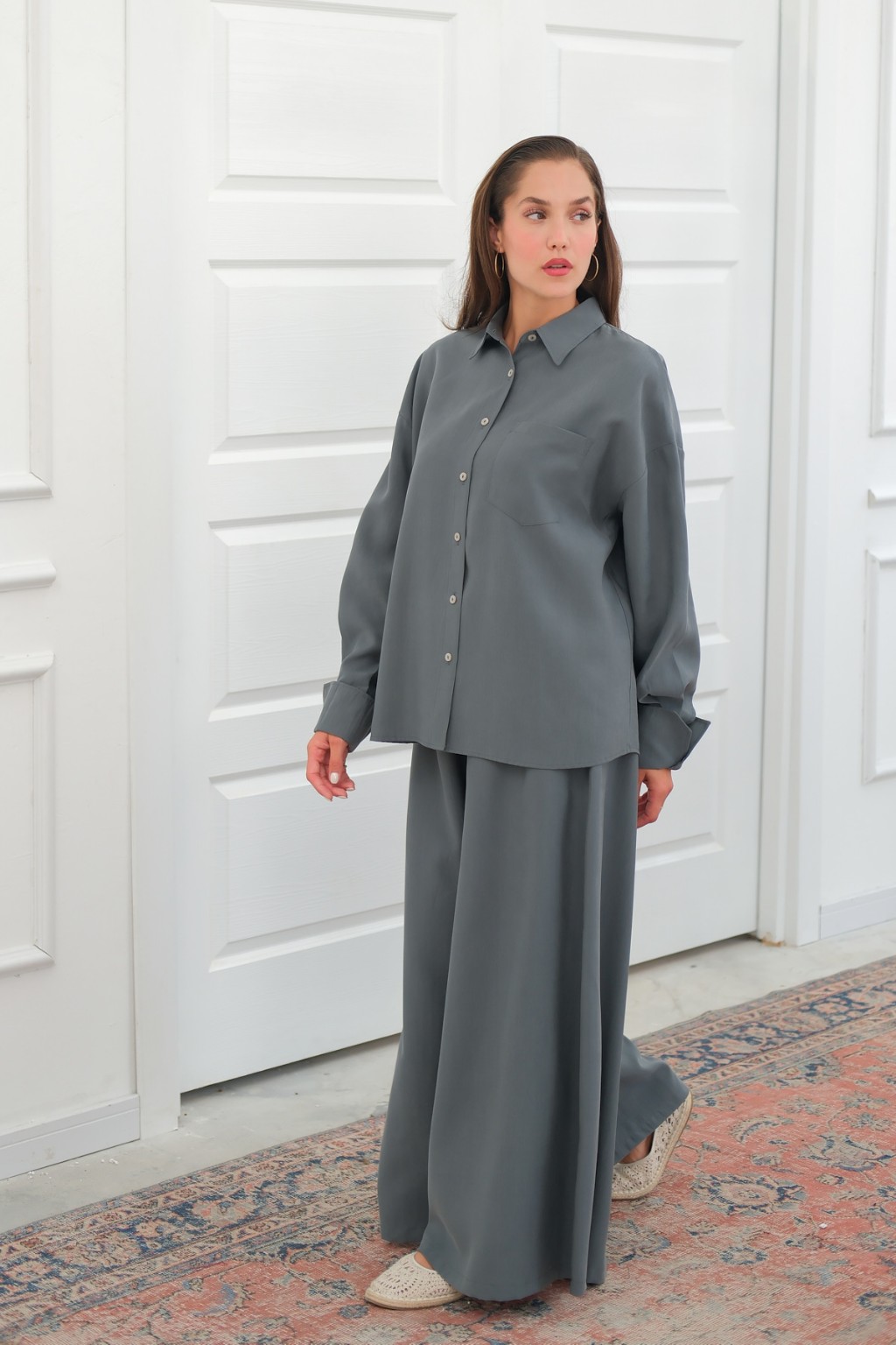 -Takımın tamamlayıcı parçası olan gömlek; önü düğmeli yapısı, geniş manşetleri ve klasik yakasıyla zamansız bir şıklık sunar. Arkasındaki pilikaşe detayı ise tasarıma zarif bir hareket kazandırır.