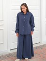 -Takımın tamamlayıcı parçası olan gömlek; önü düğmeli yapısı, geniş manşetleri ve klasik yakasıyla zamansız bir şıklık sunar. Arkasındaki pilikaşe detayı ise tasarıma zarif bir hareket kazandırır.