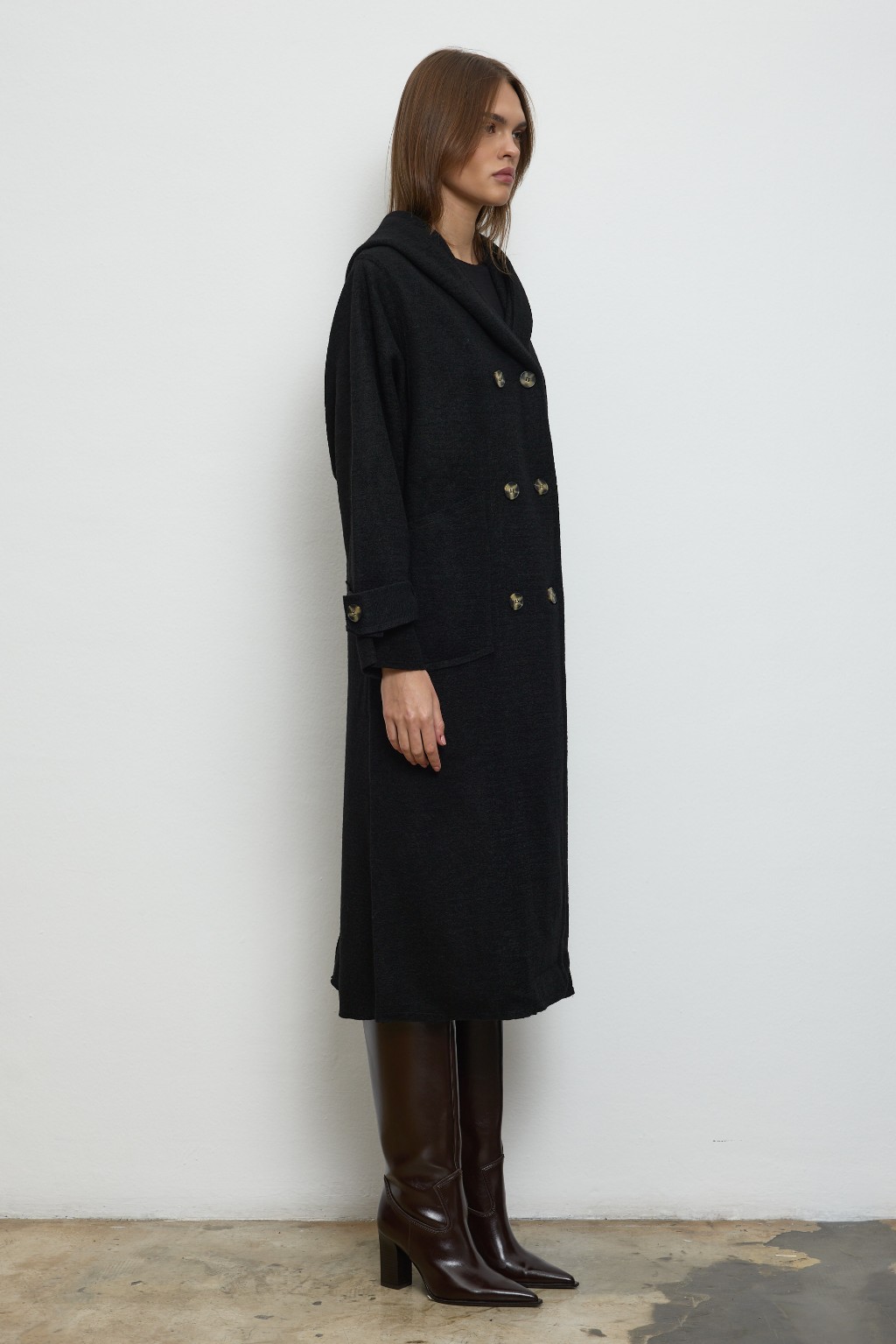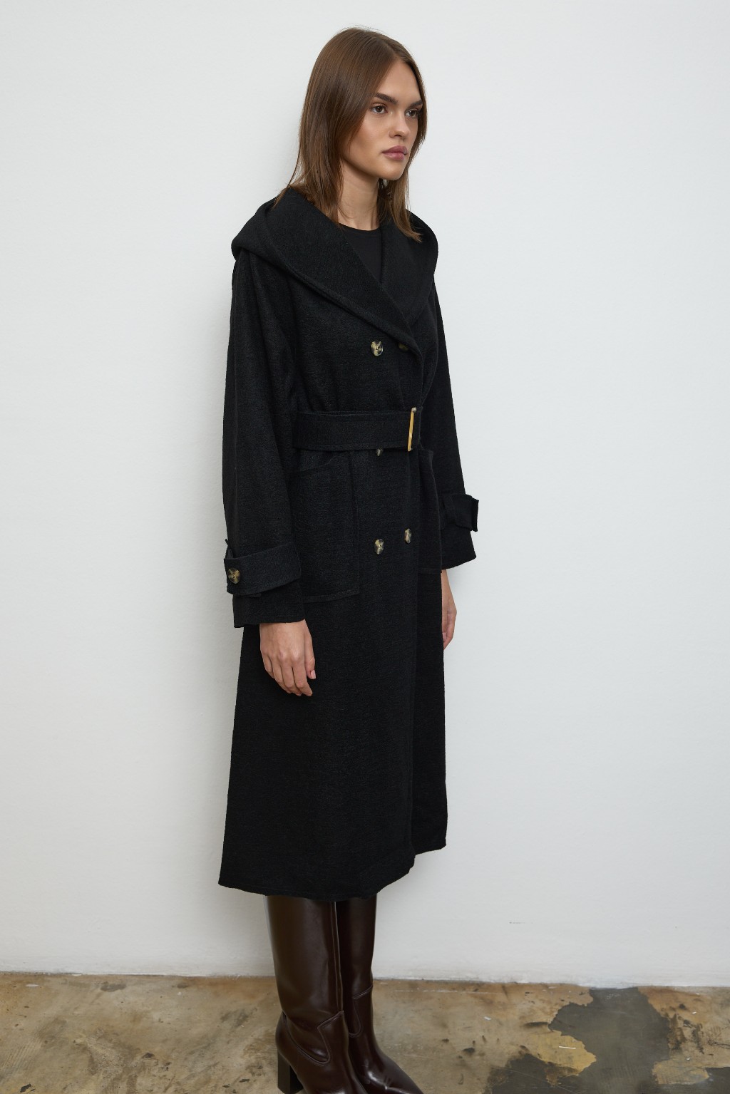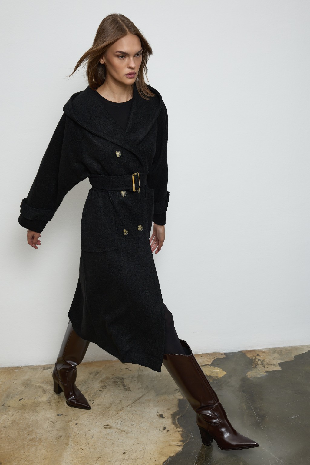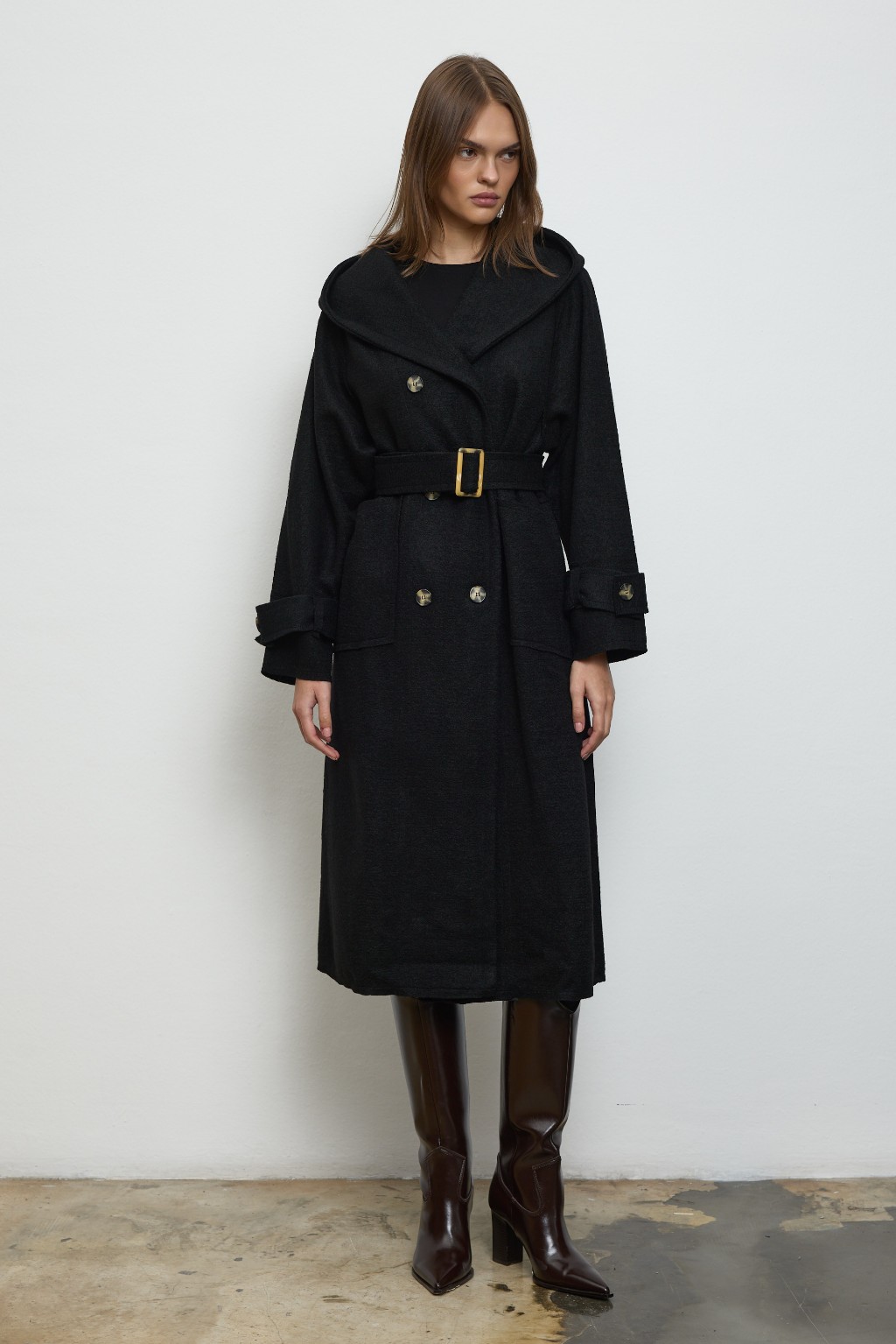 -Şapkalı tasarımı, 6 adet düğmesi ve aynı kumaştan kuşağı ile şıklığı tamamlar.