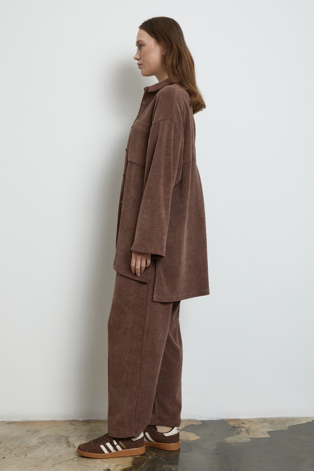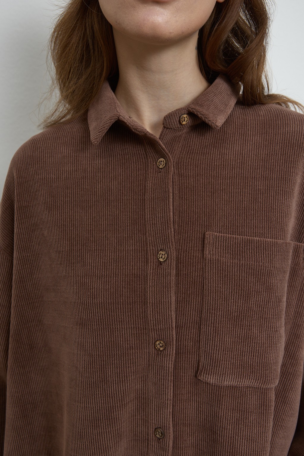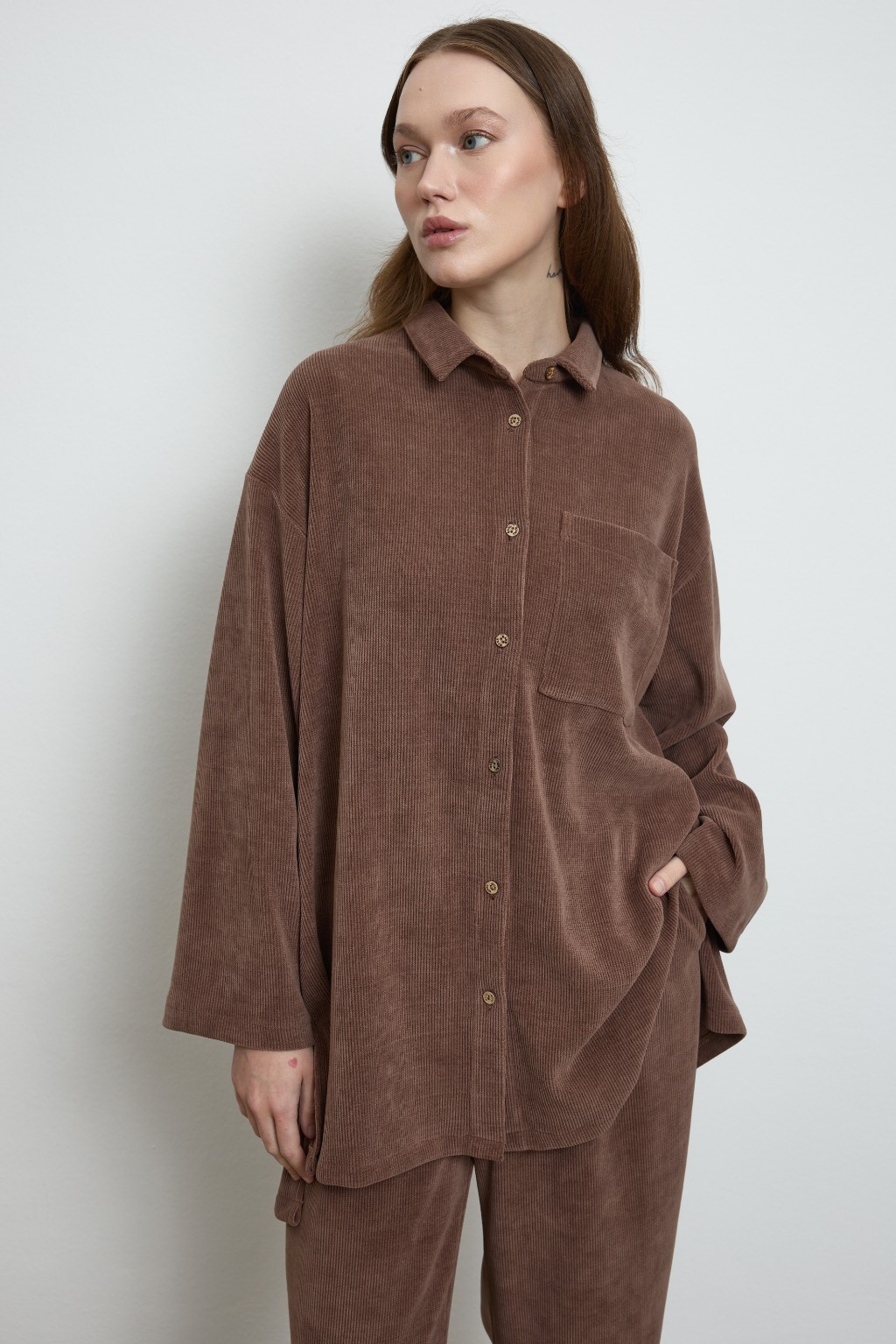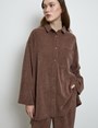-Oversize kesimiyle öne çıkan gömlek, önü düğmeli ve yakalı yapısıyla klasik dokunuşları çağdaş bir çizgiyle buluşturuyor.