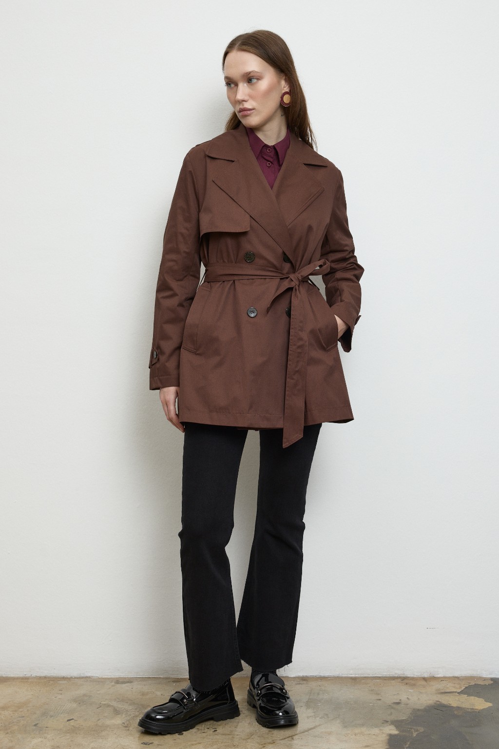 -Modern şehir kadınının stilini tamamlayan bu özel tasarım trençkot, detaylara verilen özenle öne çıkıyor. Dört düğmeli zarif ön yüzeyi, iç kısmındaki gizli sabitleme sistemiyle hareket halinde bile formunu koruyor; böylece stiliniz gün boyu kusursuz kalıyor.