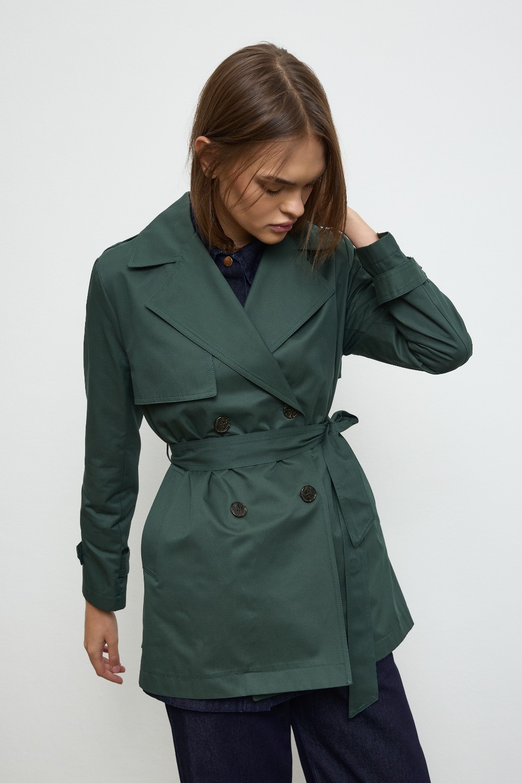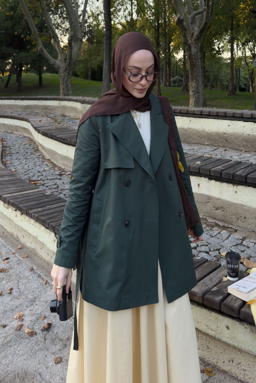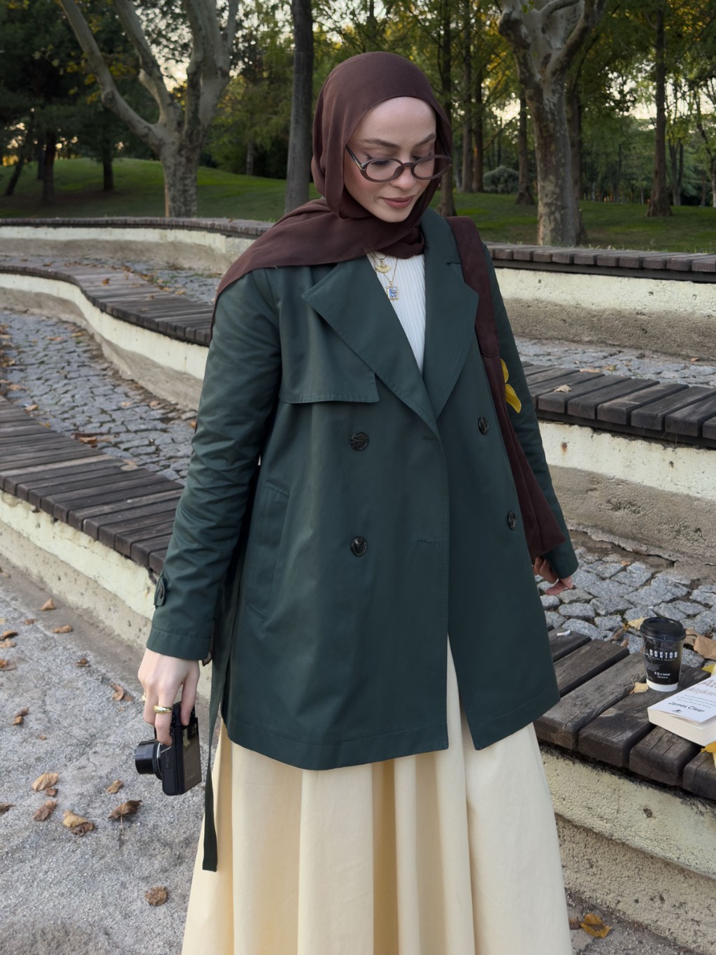 -Modern şehir kadınının stilini tamamlayan bu özel tasarım trençkot, detaylara verilen özenle öne çıkıyor. Dört düğmeli zarif ön yüzeyi, iç kısmındaki gizli sabitleme sistemiyle hareket halinde bile formunu koruyor; böylece stiliniz gün boyu kusursuz kalıyor.