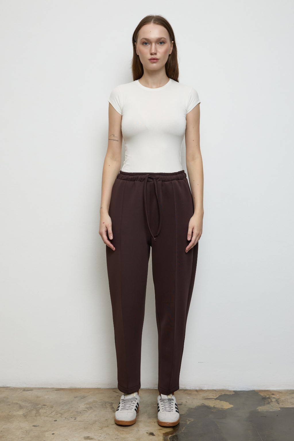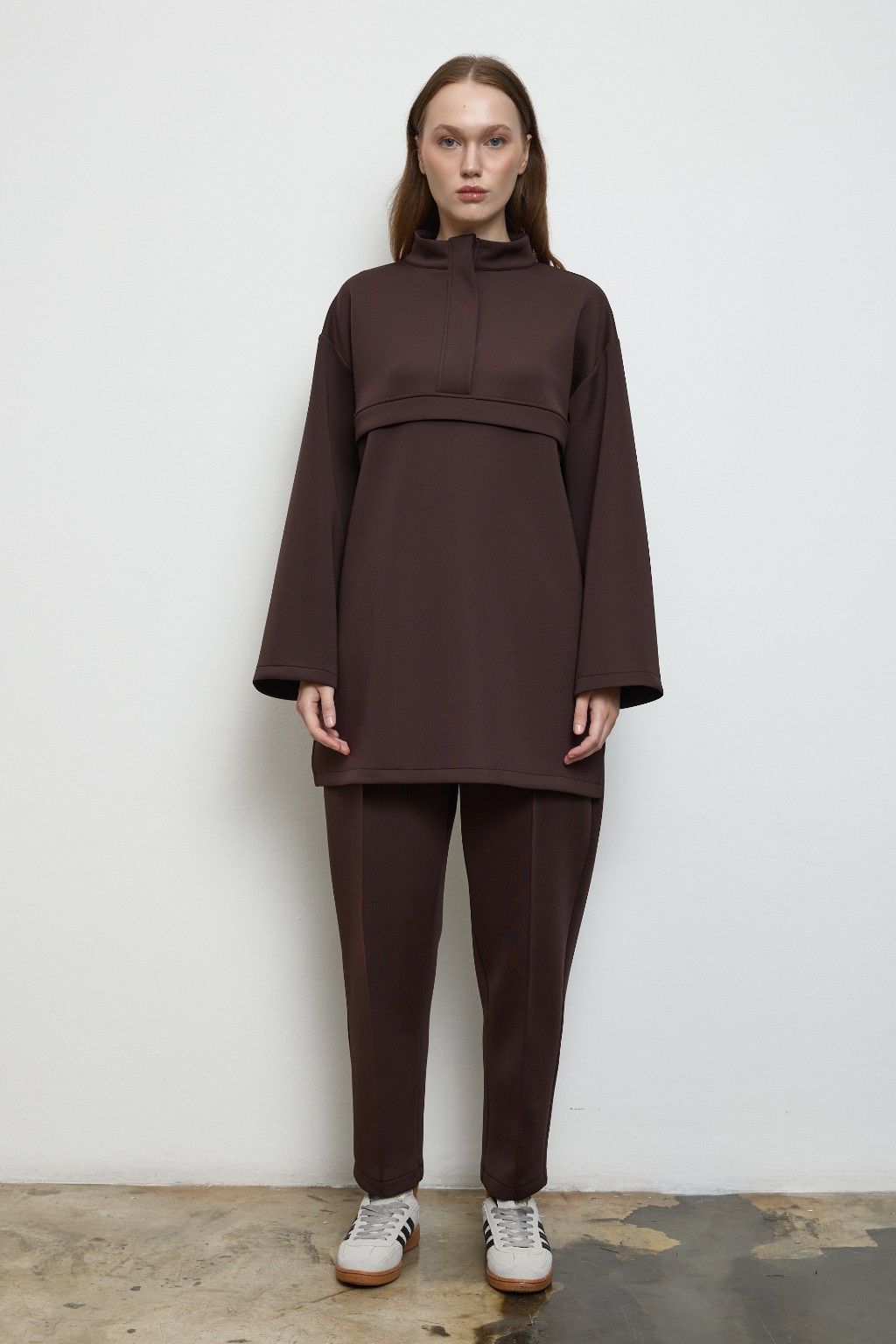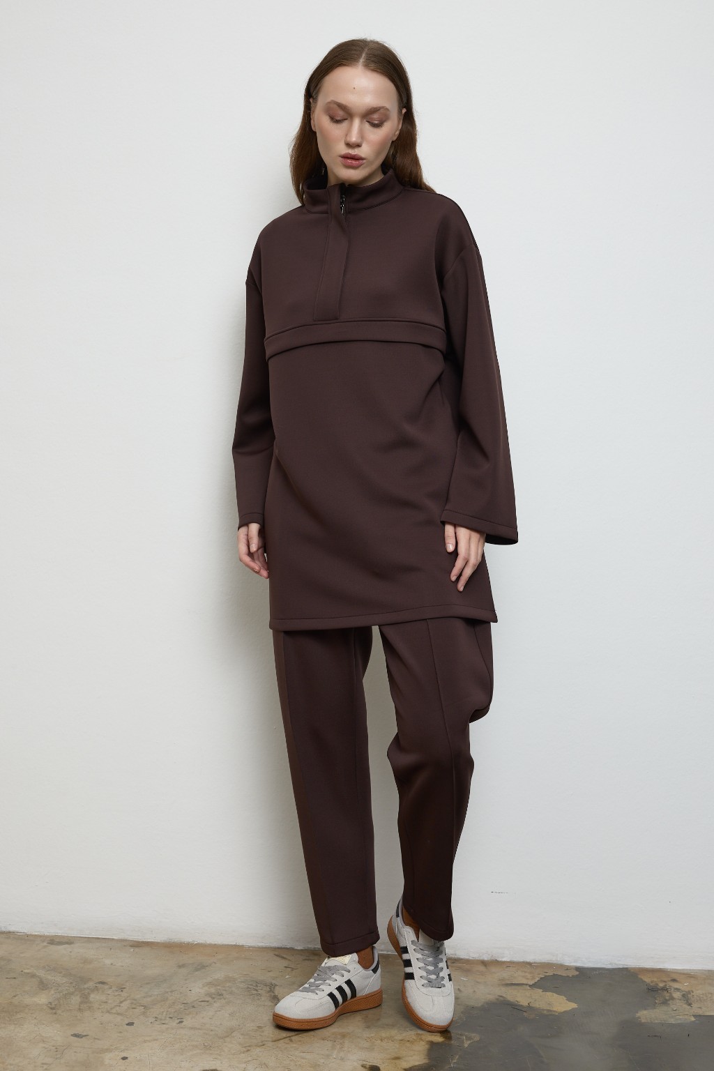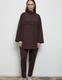 -Yumuşak dokulu, formunu koruyan scuba kumaşı sayesinde gün boyu konfor sunarken, takımın sweatshirt parçası yarım gizli fermuar detayı ve göğüs altındaki dikişle hareketli bir siluet yaratır. Hem sade hem iddialı.