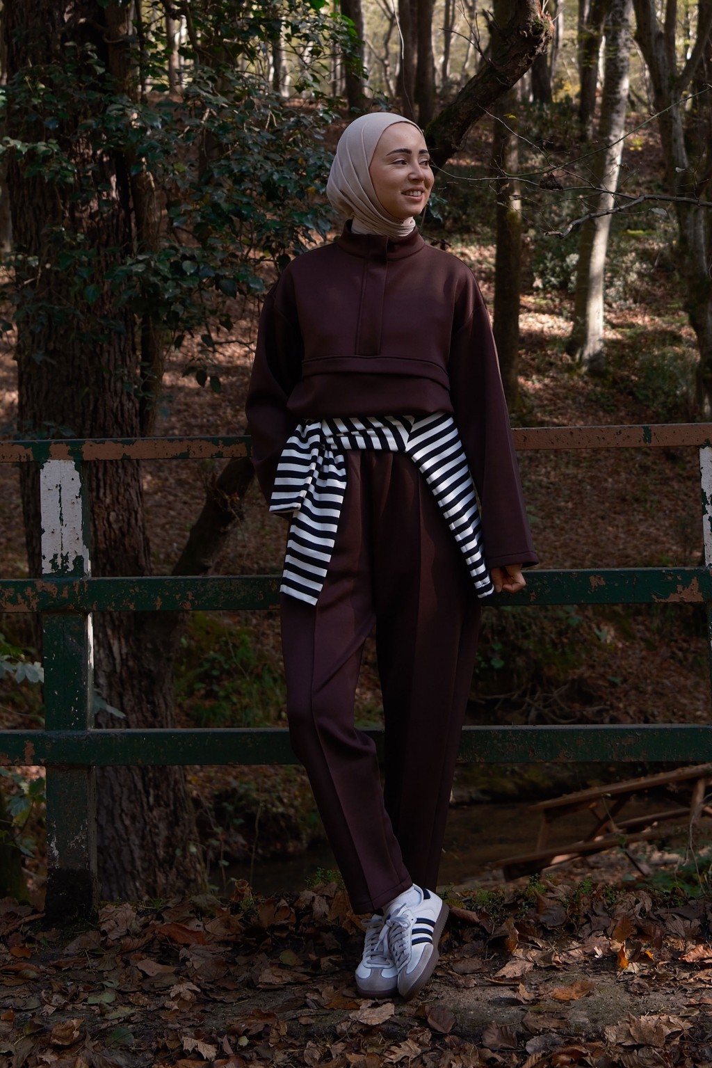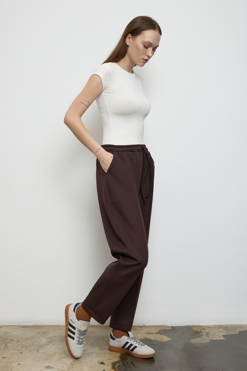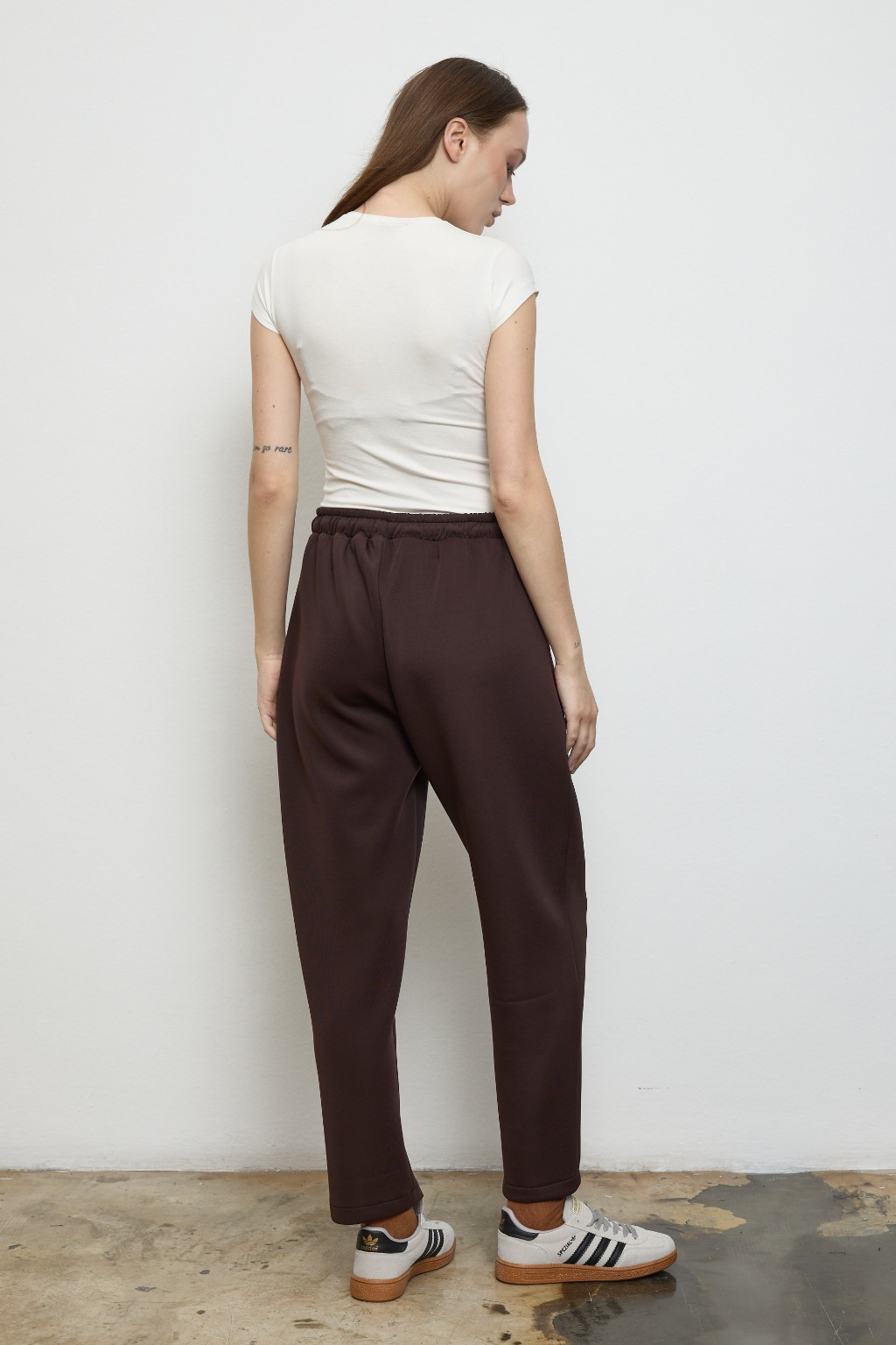 -Yumuşak dokulu, formunu koruyan scuba kumaşı sayesinde gün boyu konfor sunarken, takımın sweatshirt parçası yarım gizli fermuar detayı ve göğüs altındaki dikişle hareketli bir siluet yaratır. Hem sade hem iddialı.