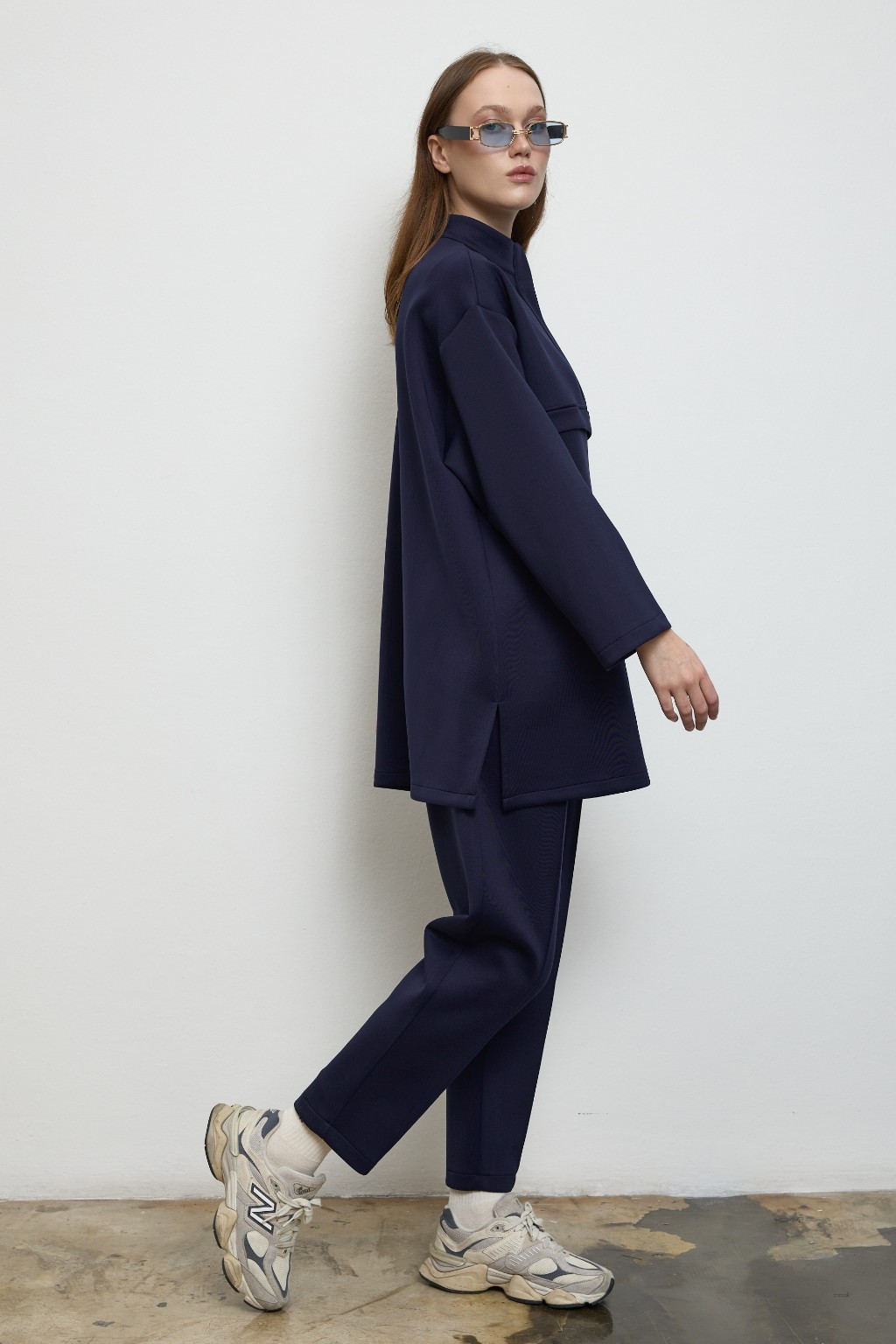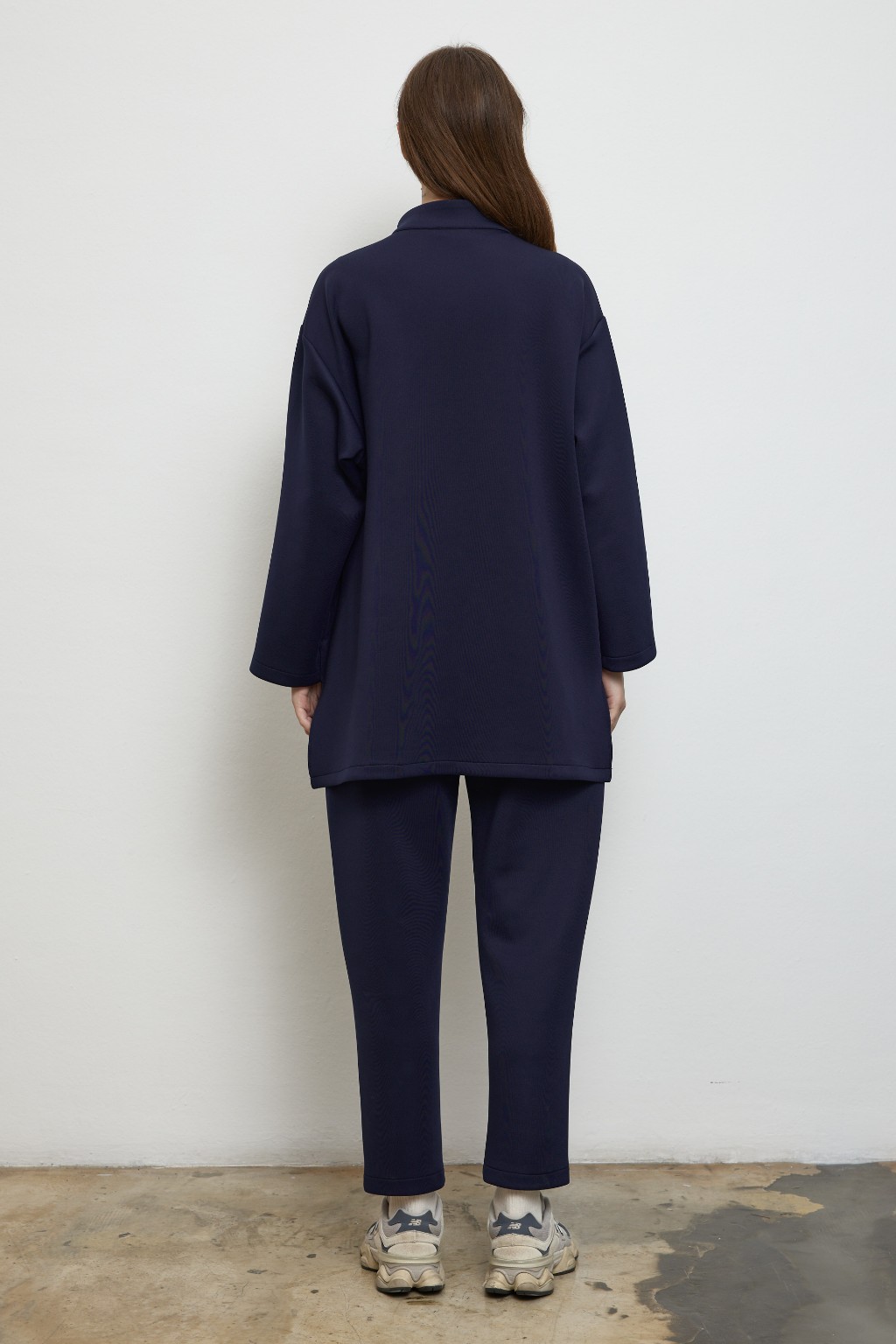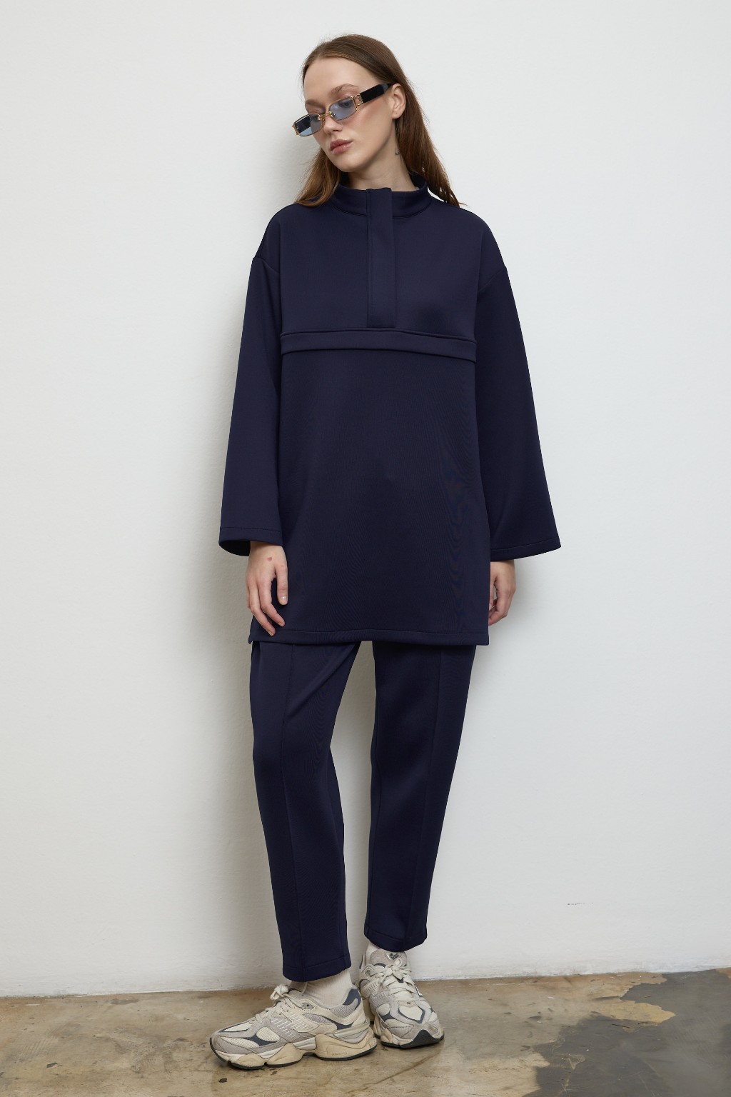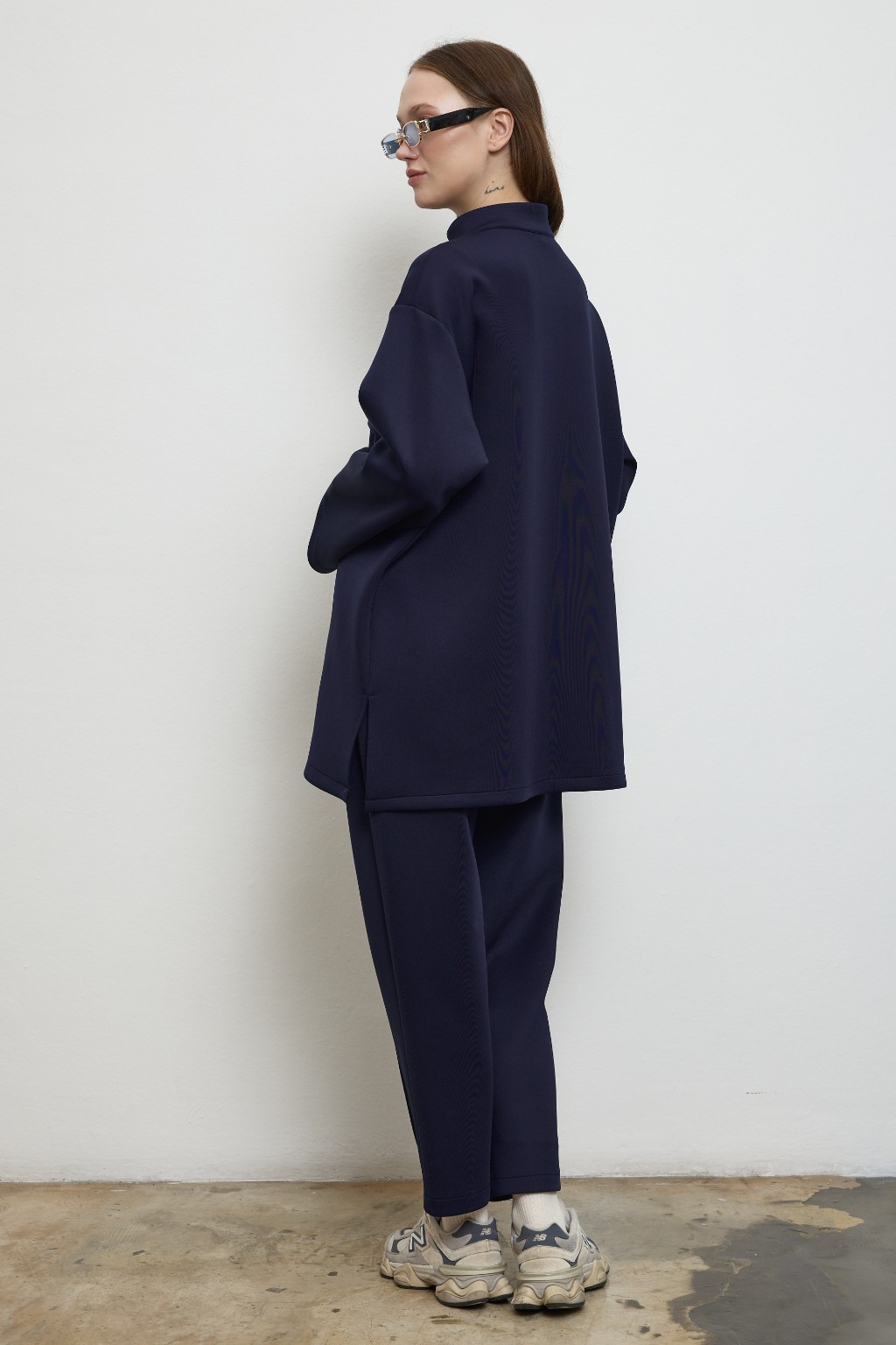 -Yumuşak dokulu, formunu koruyan scuba kumaşı sayesinde gün boyu konfor sunarken, takımın sweatshirt parçası yarım gizli fermuar detayı ve göğüs altındaki dikişle hareketli bir siluet yaratır. Hem sade hem iddialı.