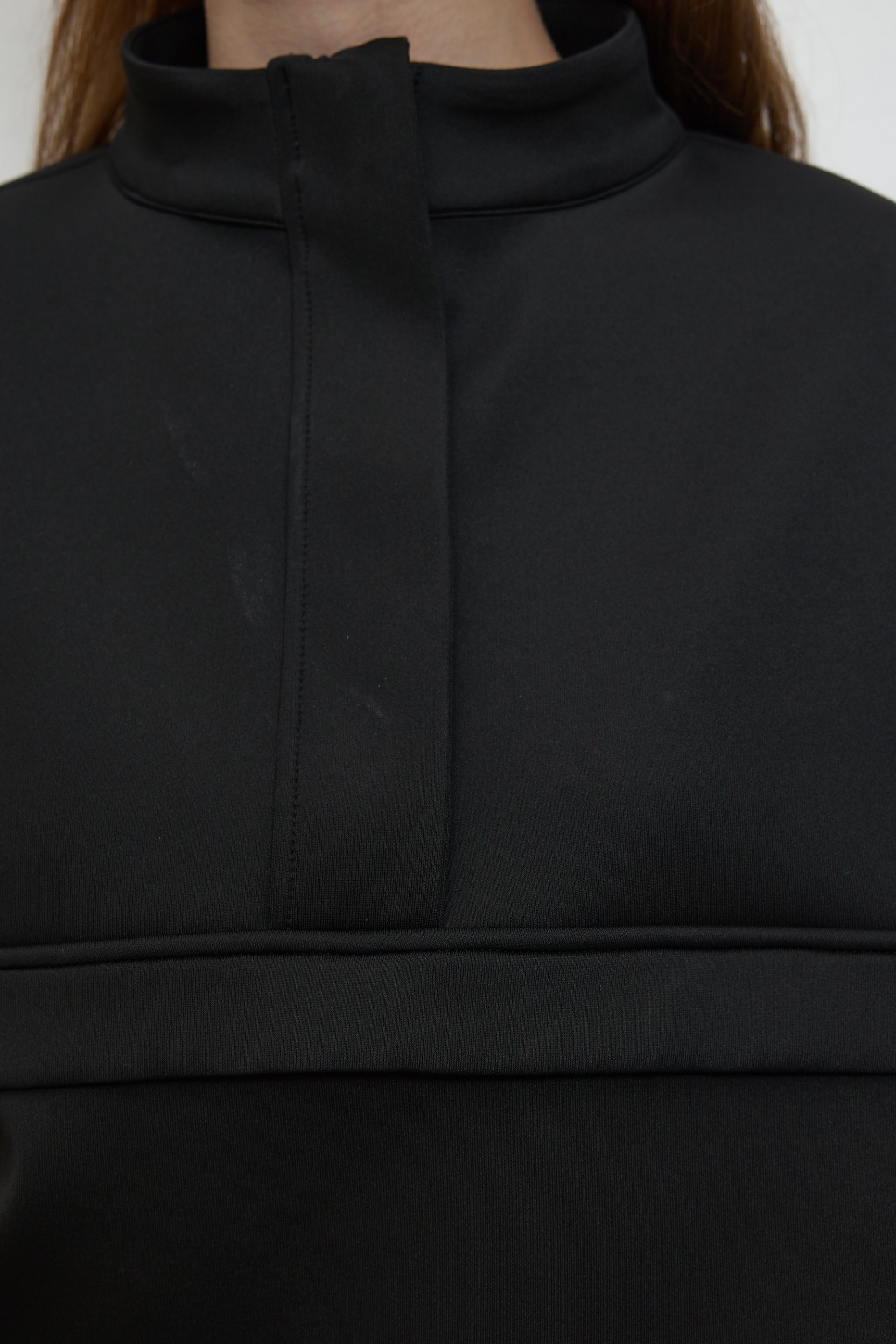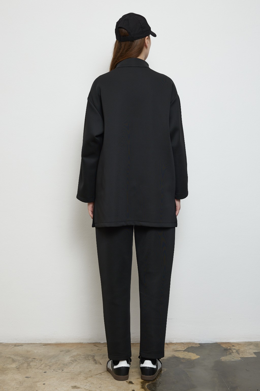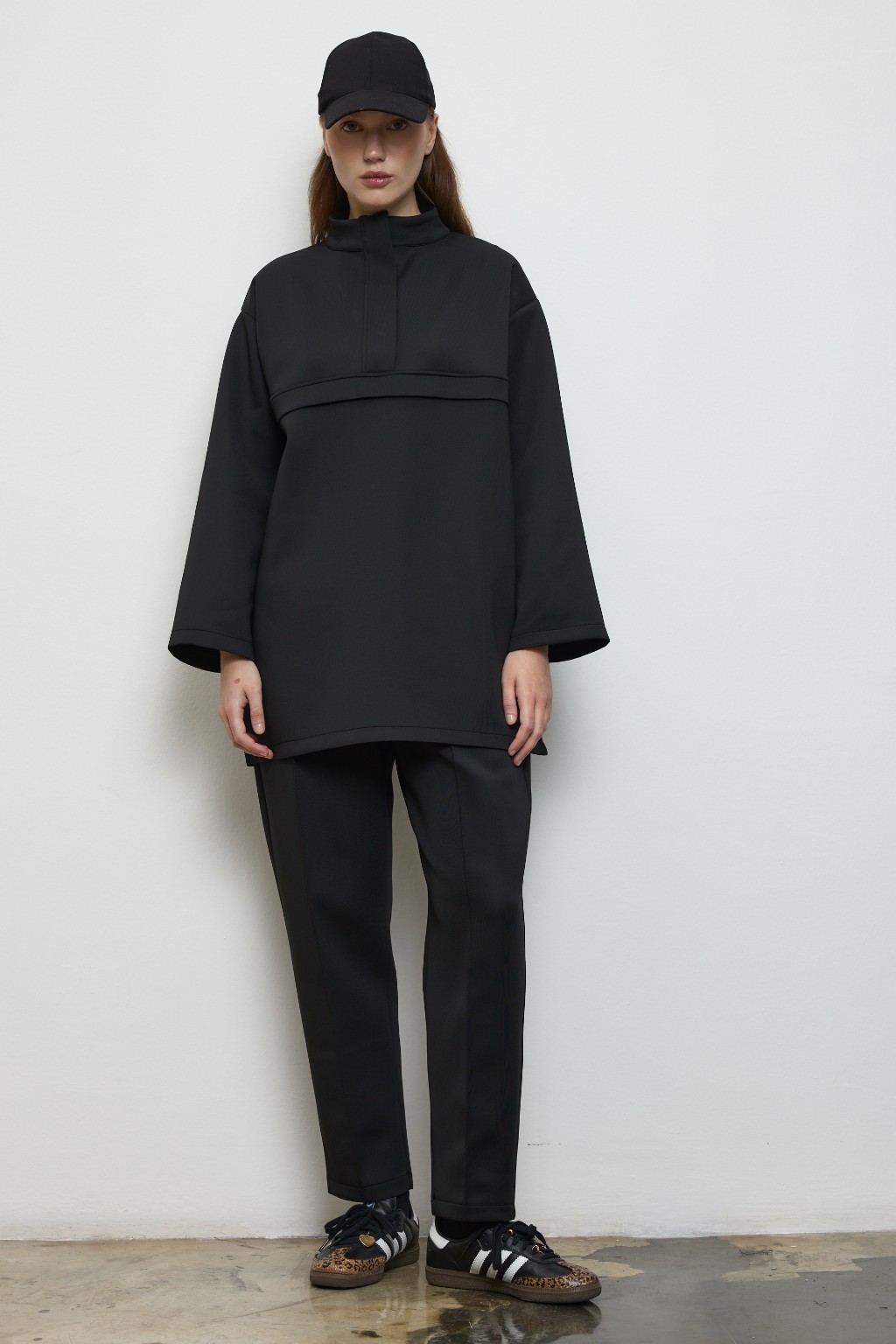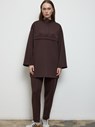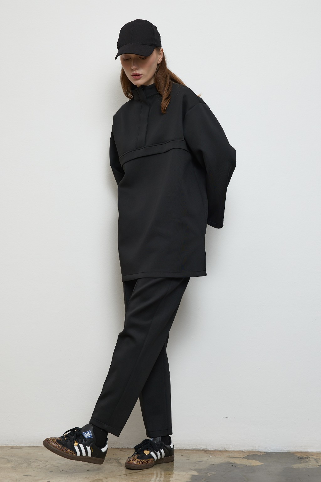 -Yumuşak dokulu, formunu koruyan scuba kumaşı sayesinde gün boyu konfor sunarken, takımın sweatshirt parçası yarım gizli fermuar detayı ve göğüs altındaki dikişle hareketli bir siluet yaratır. Hem sade hem iddialı.