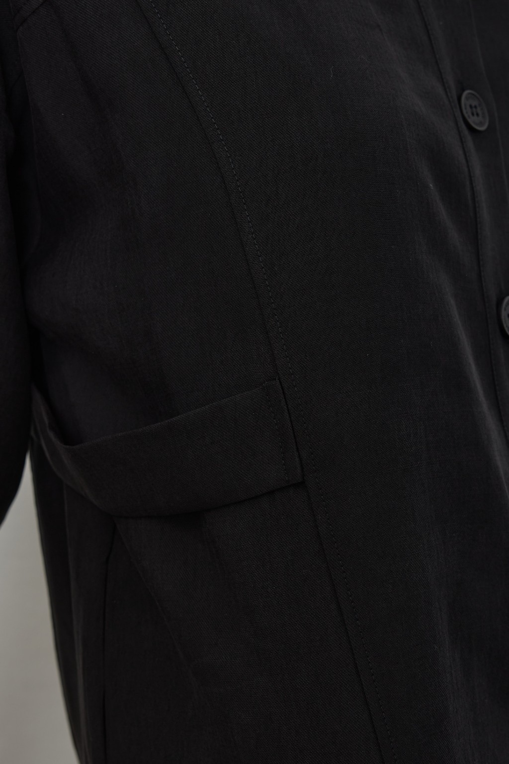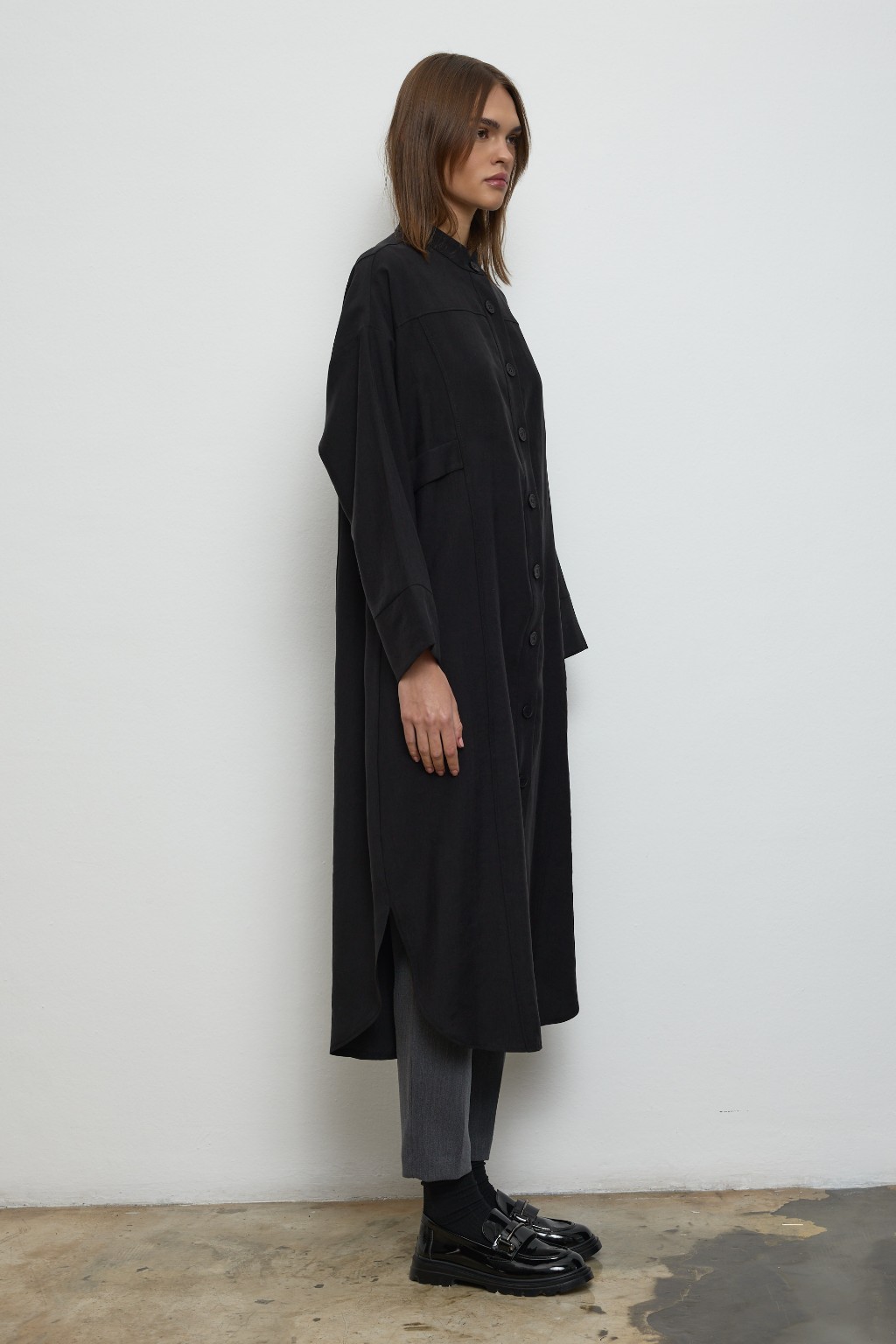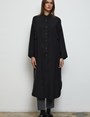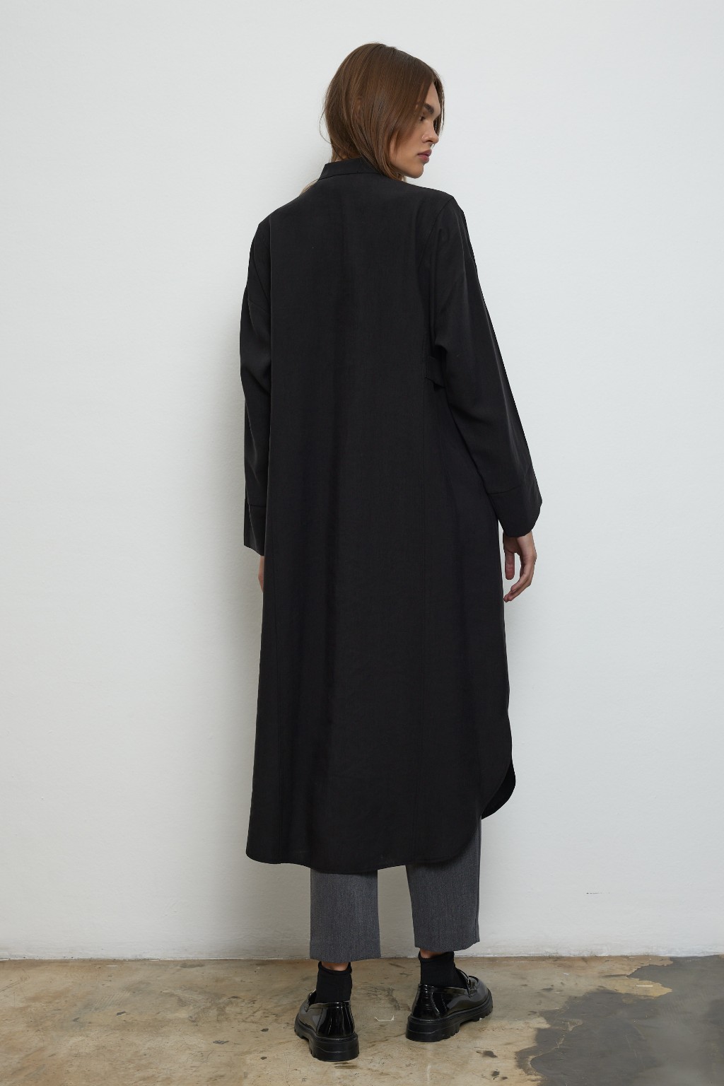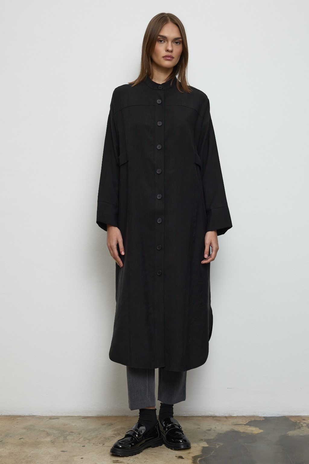 -Tüm düğmeleri kendi rengiyle özel olarak boyanarak bütüncül ve sade bir görünüm sağlanırken, iki yandaki bel şeritleri tunik formuna modern bir dokunuş katıyor. Alt kısmındaki oval kesim, hareketli bir siluet sunarken kalın manşetli kollar, tasarıma güçlü bir karakter kazandırıyor.