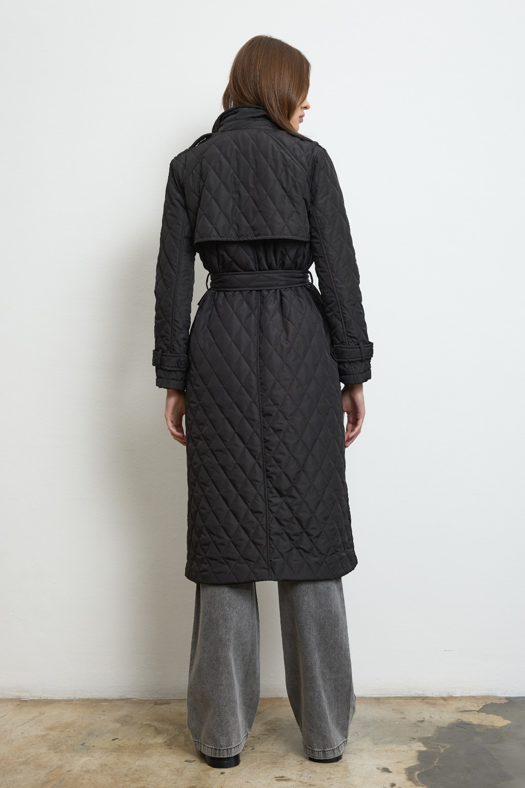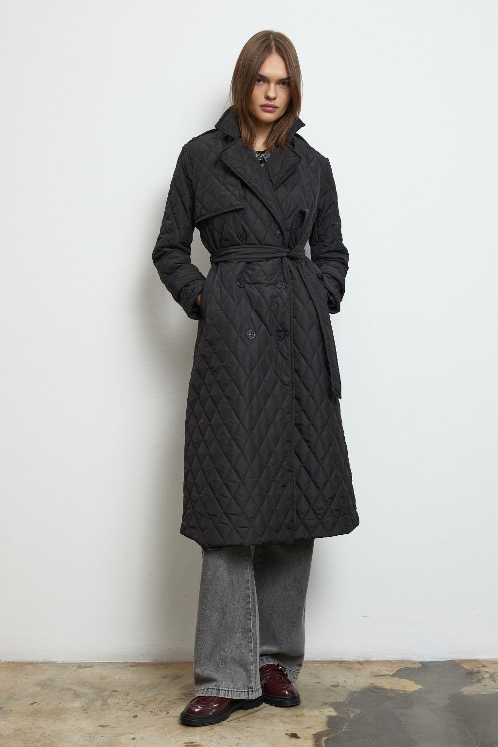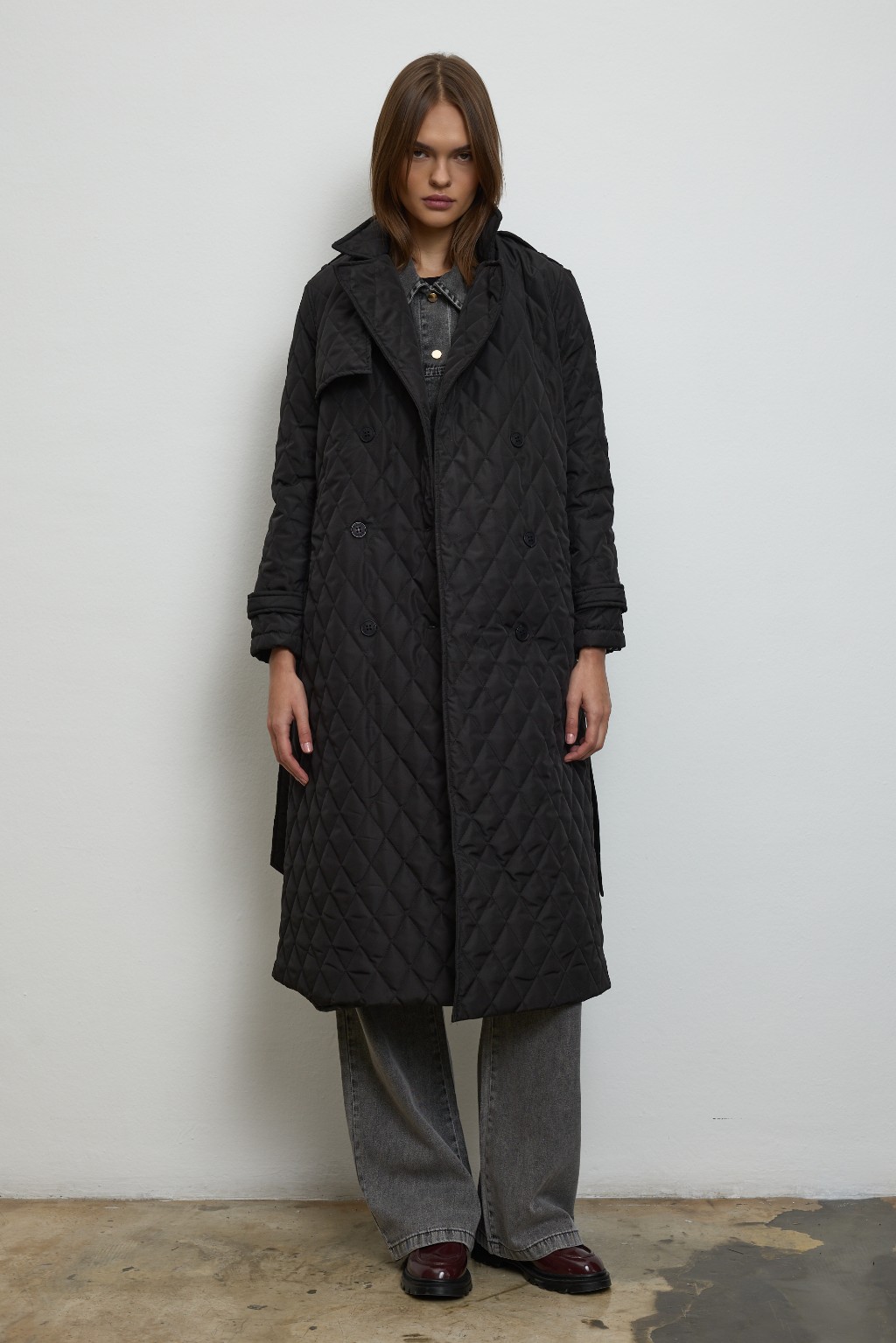 -Altı düğmeli kruvaze kapaması, tek omuzda yer alan ekstra kapama detayı ve omuz-kollardaki apoletlerle güçlü bir duruş sergiler. Arka kısmındaki rüzgarlık detayı ise klasik trençkot havasını modern bir siluetle buluşturur.