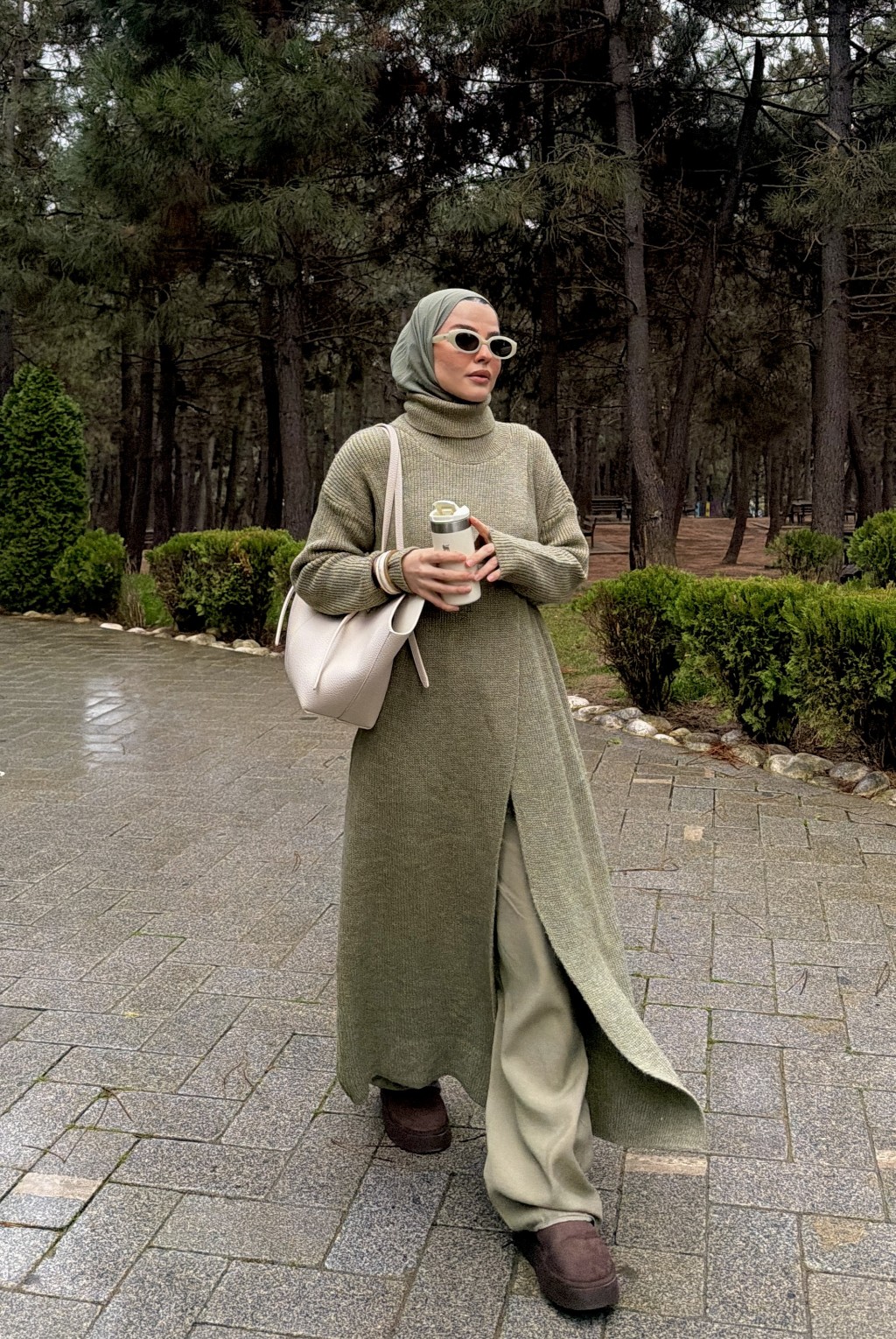 Qanu Yırtmaçlı Triko Tunik Çağla Yeşili