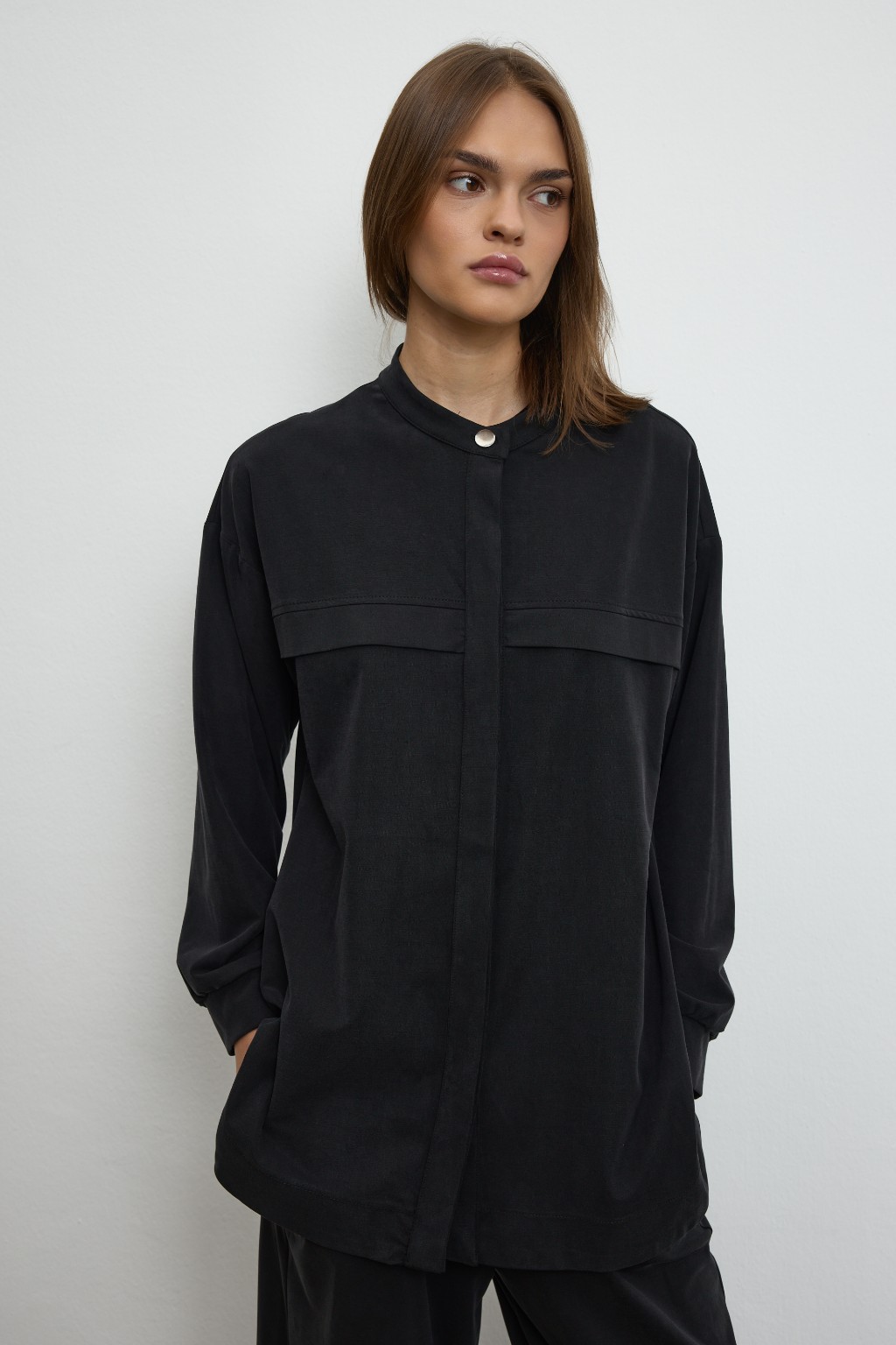 -Düğme kapamalı gömlek formunda tasarlandı. Günlük kullanım kolaylığı sunan çıtçıtlı yaka detayı ve önündeki aller  detayıyla modern ve feminen bir görünüm sunar. Alt kısmı oval kesimli olan gömlek, iki yandaki yırtmaçlarla hareket özgürlüğü ve dökümlü bir şıklık kazandırır.