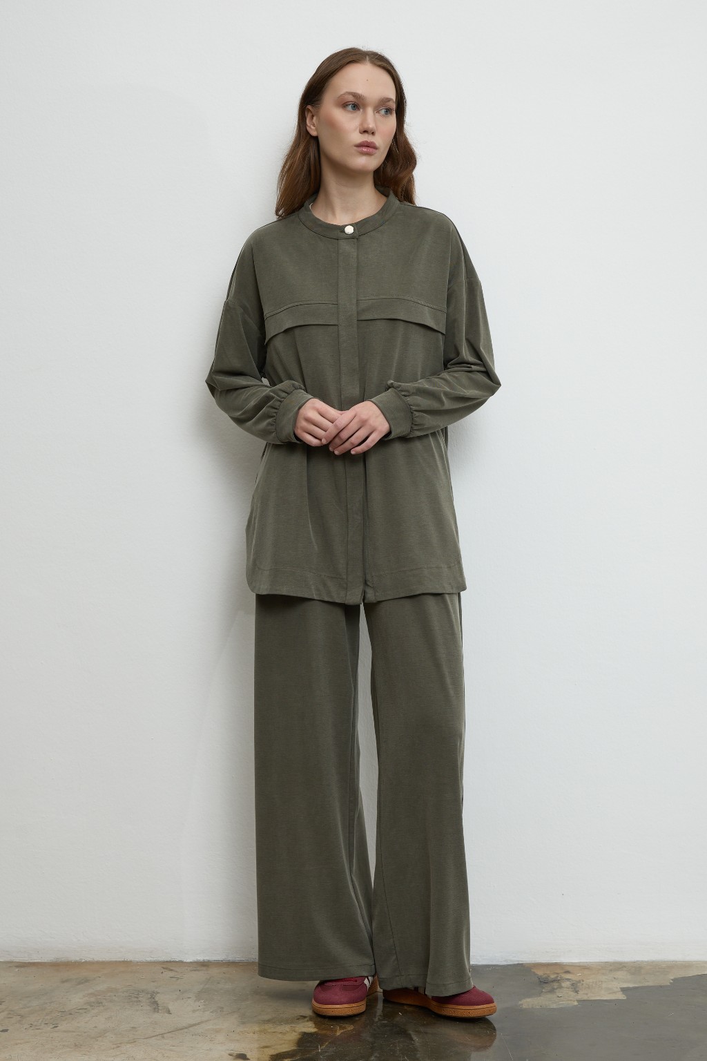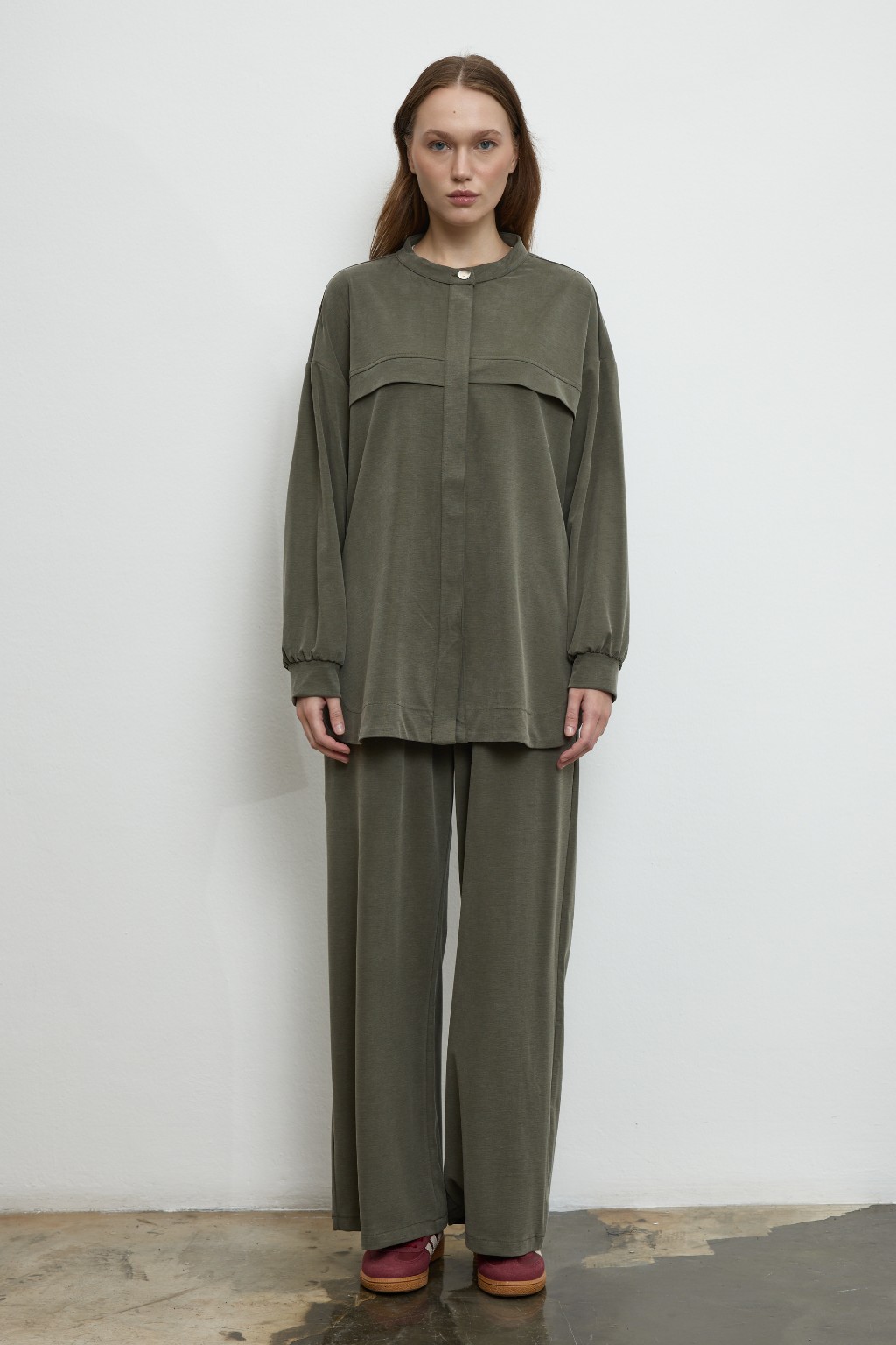 -Düğme kapamalı gömlek formunda tasarlandı. Günlük kullanım kolaylığı sunan çıtçıtlı yaka detayı ve önündeki aller  detayıyla modern ve feminen bir görünüm sunar. Alt kısmı oval kesimli olan gömlek, iki yandaki yırtmaçlarla hareket özgürlüğü ve dökümlü bir şıklık kazandırır.