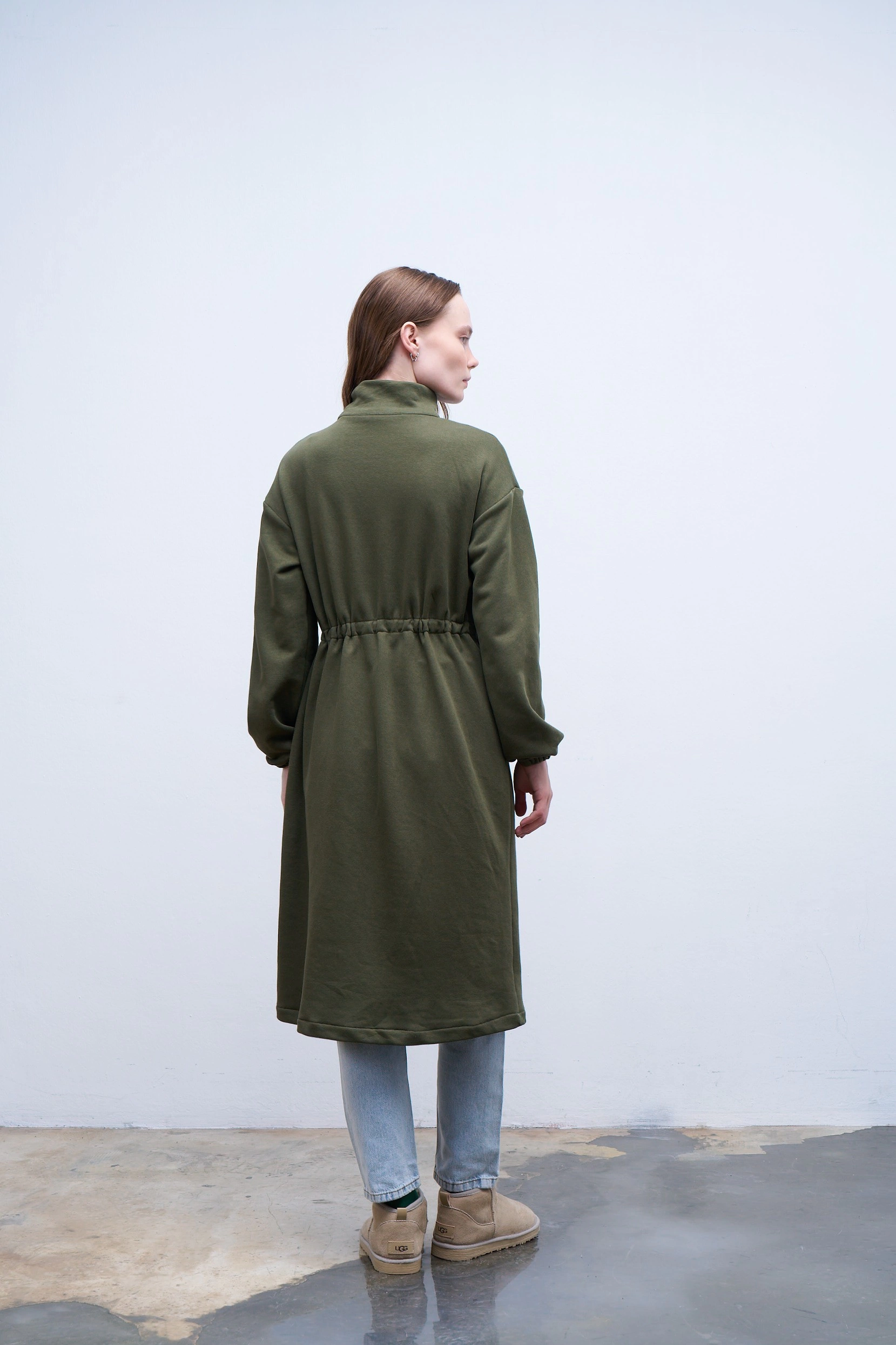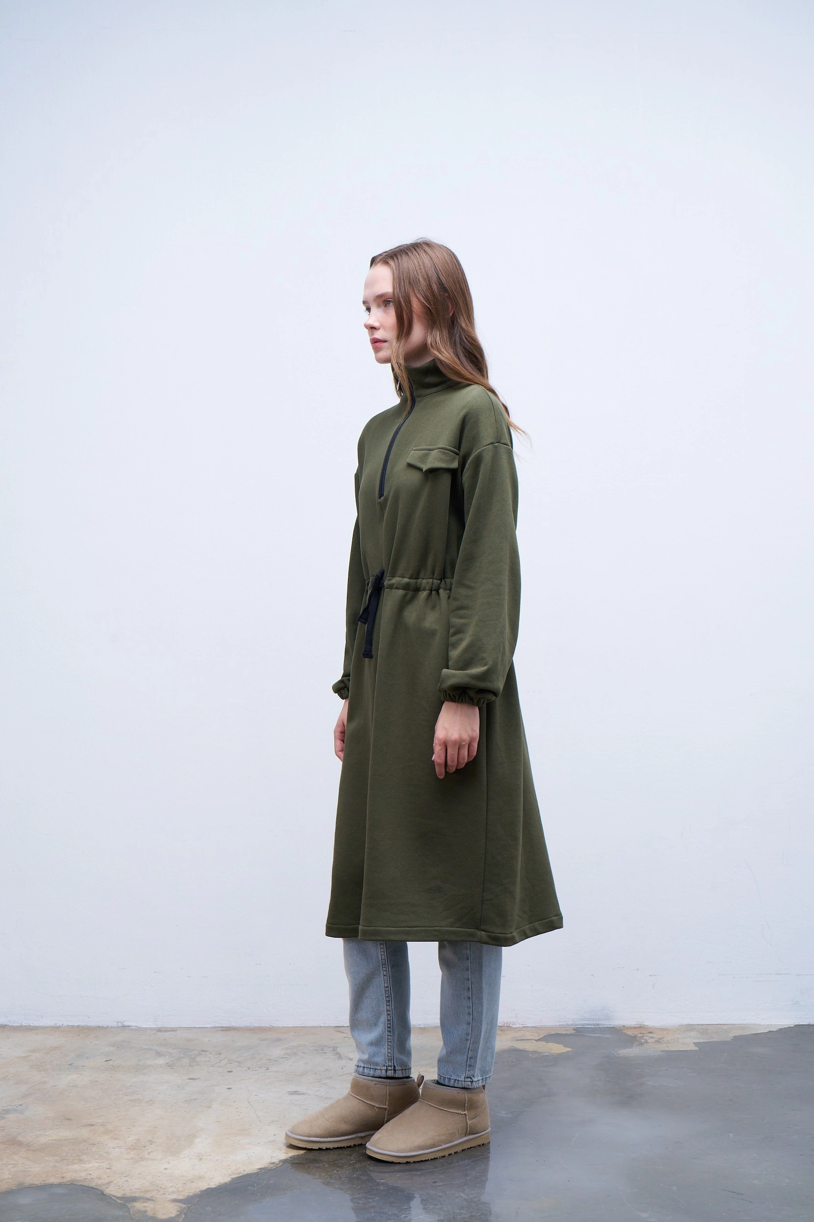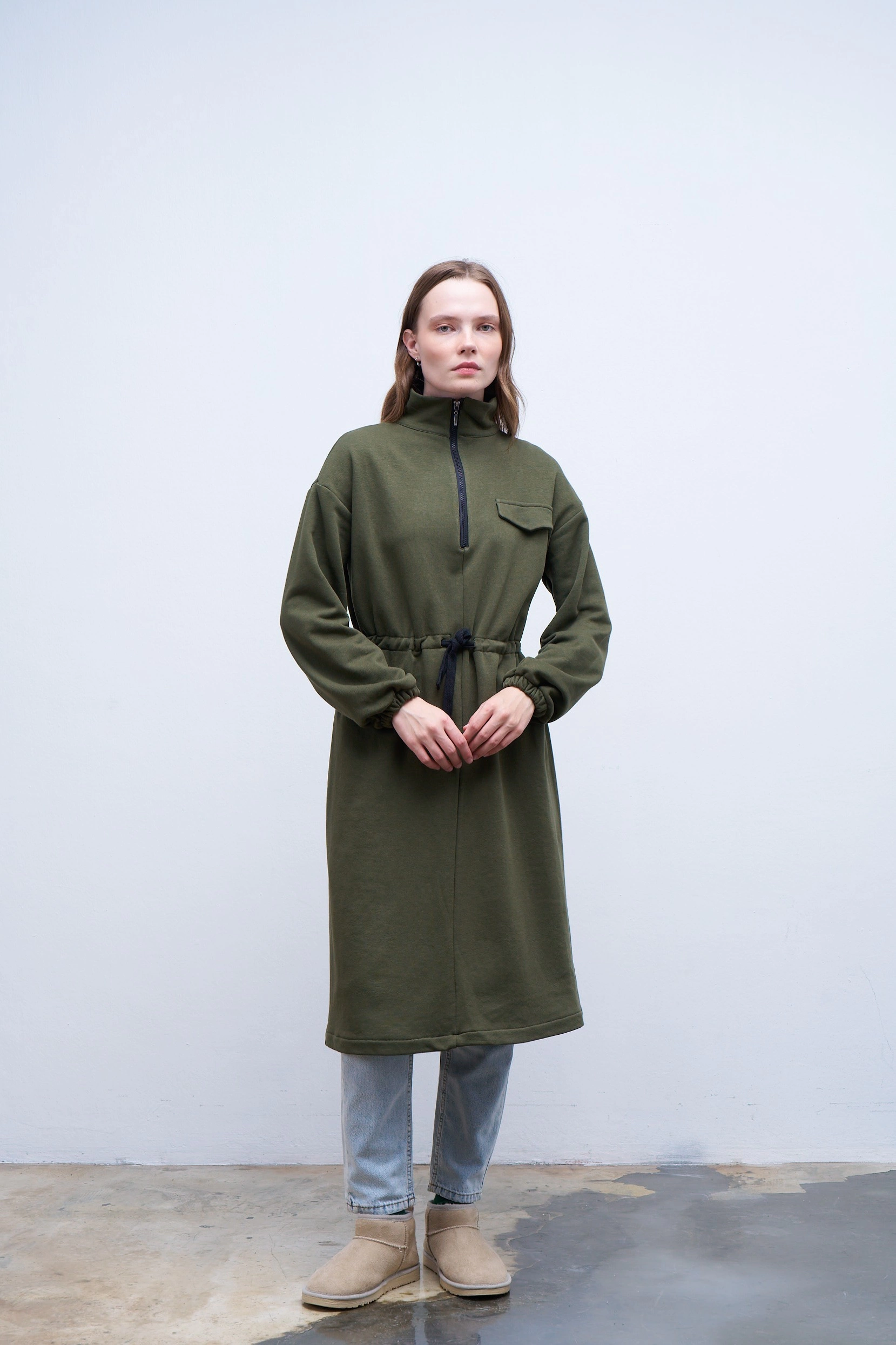 Qanu Pamuklu Büzgülü Elbise Yeşil