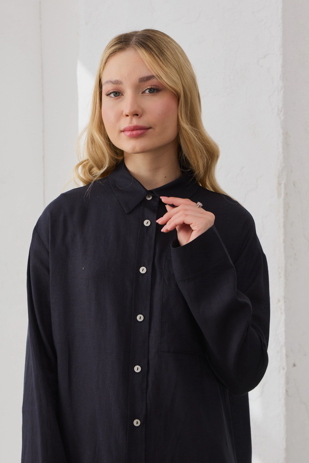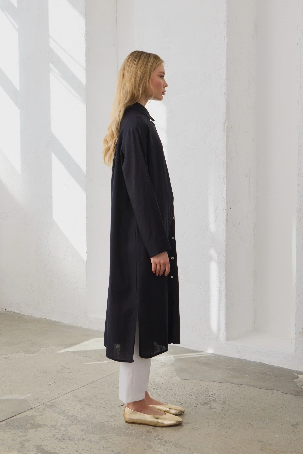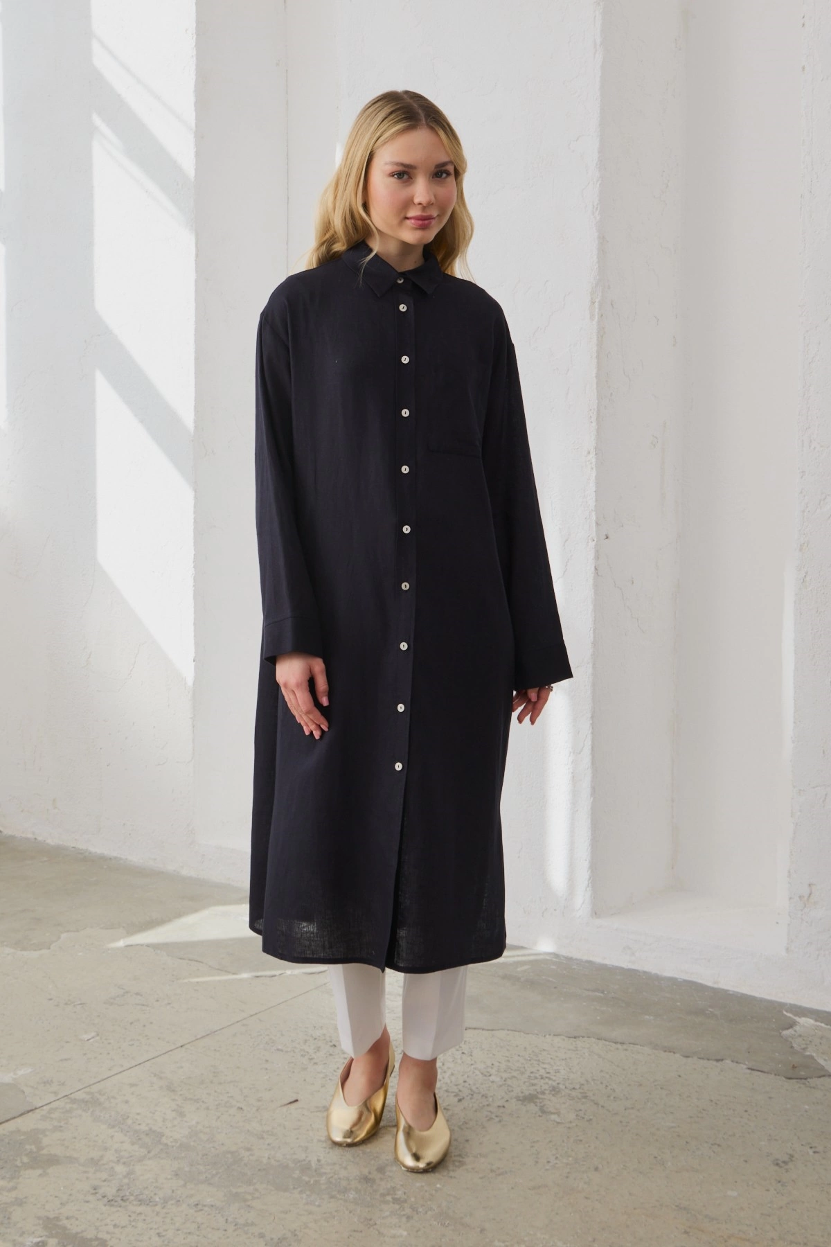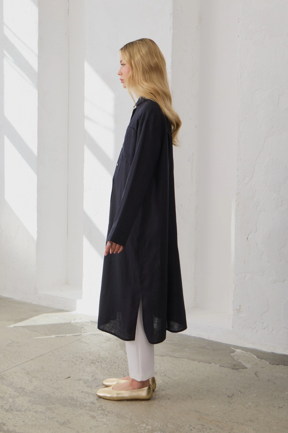 Qanu Tek Cepli Keten Uzun Gömlek Lacivert