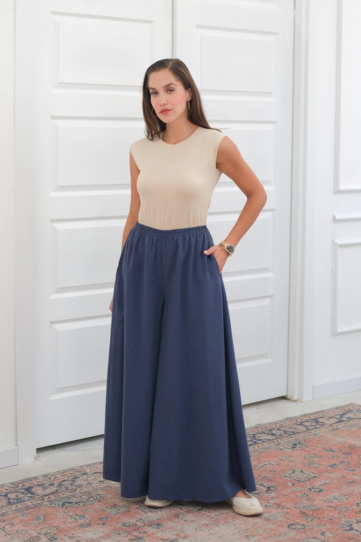 Qanu Çift Bel Detaylı Pantolon Lacivert