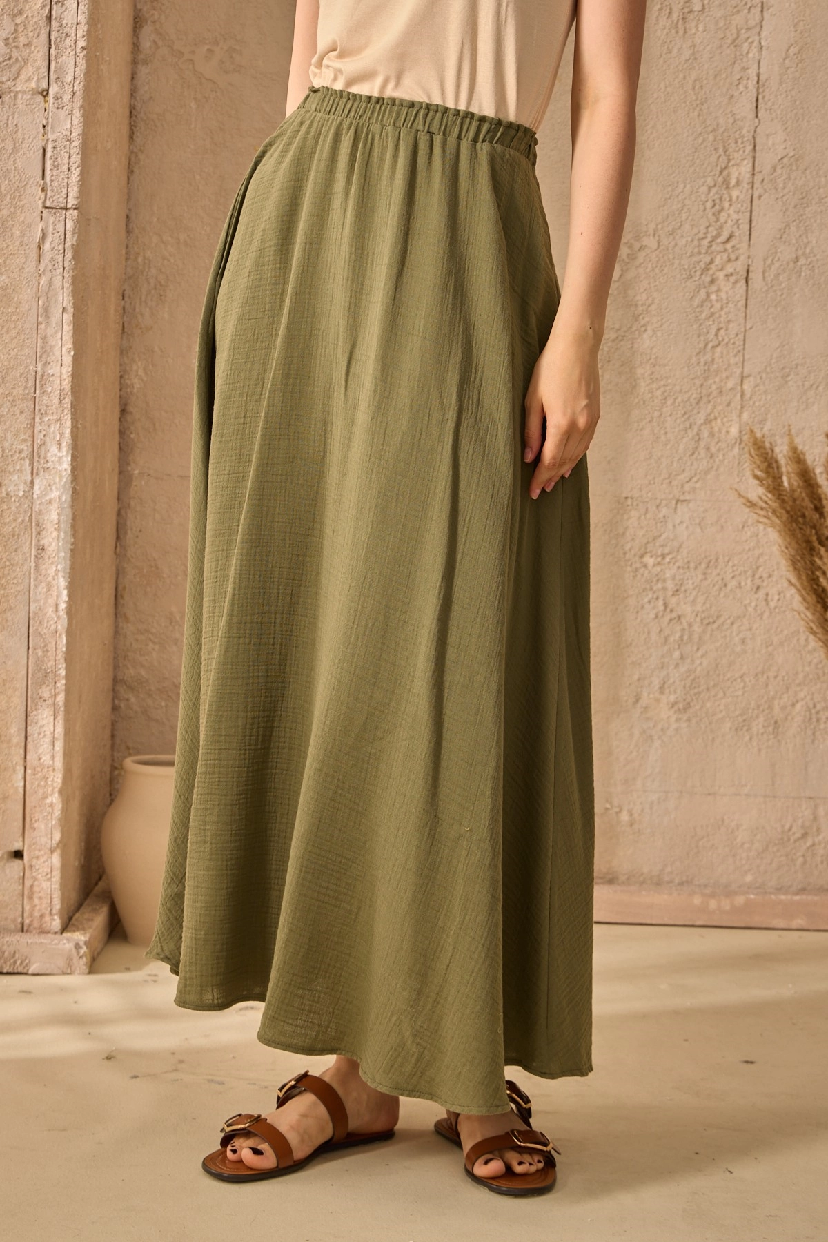 Qanu Beli Lastikli Krep Pantolon Yeşil