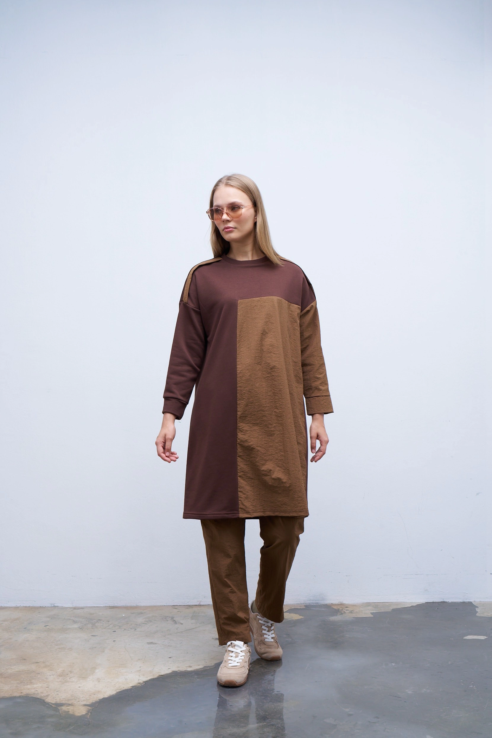 Qanu V Yaka Uzun Sweatshirt Kahverengi
